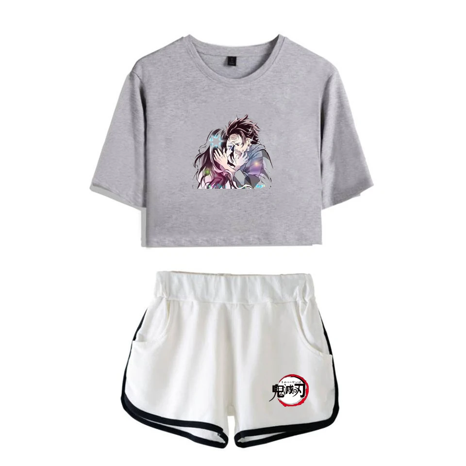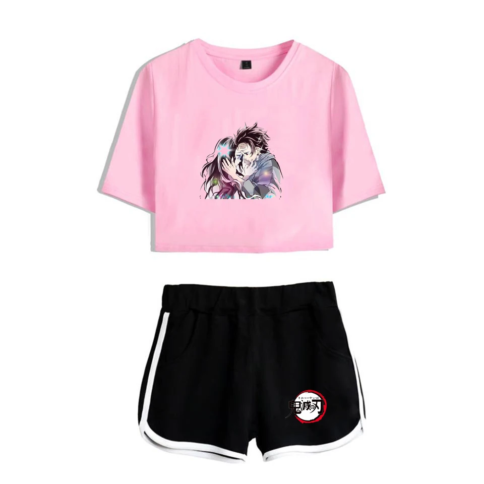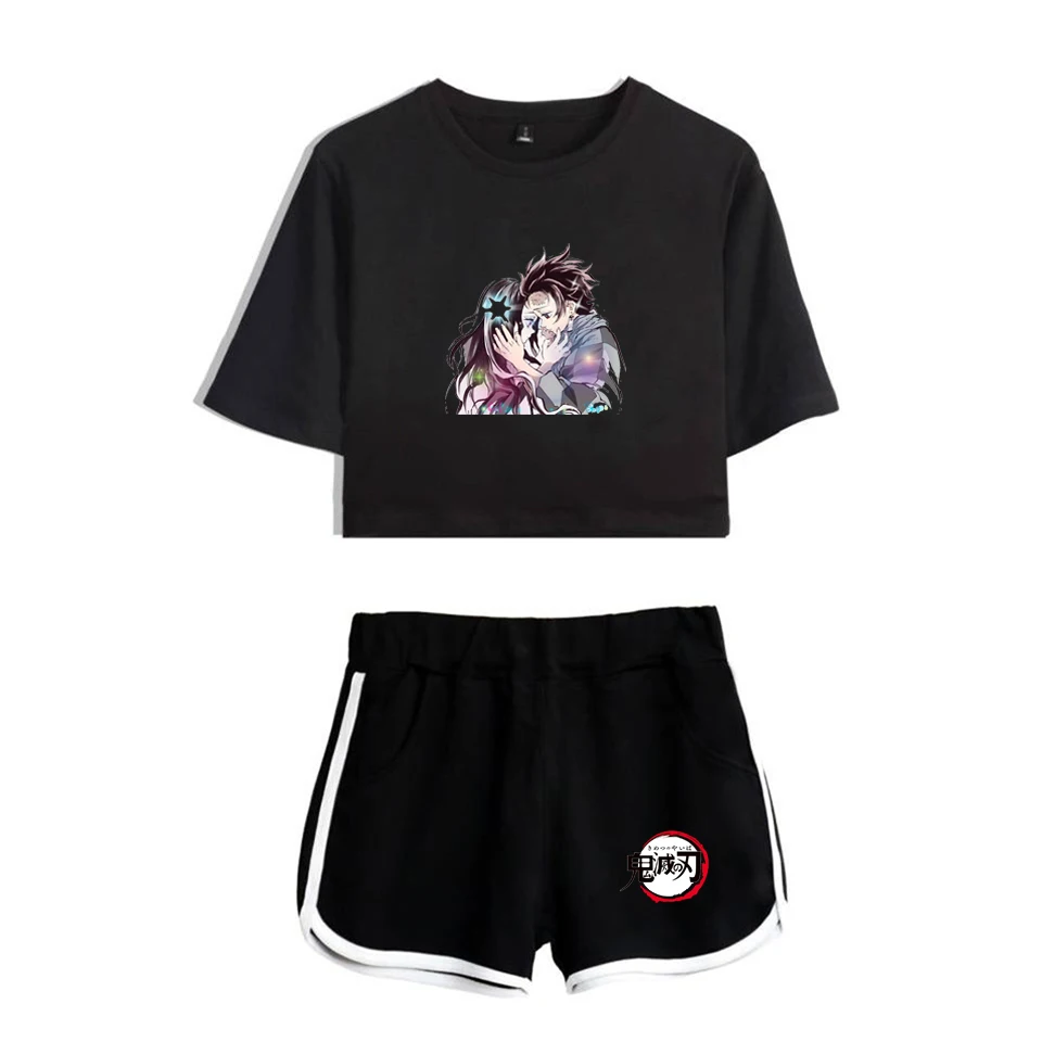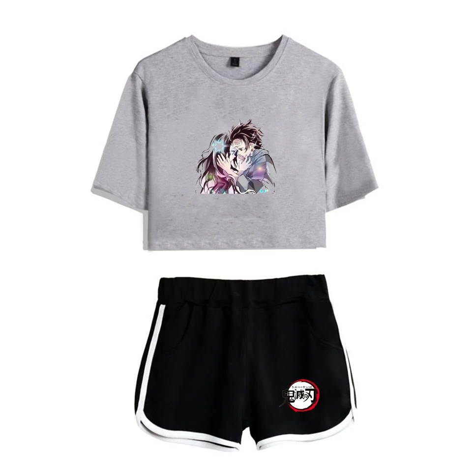 Костюм женский летний из двух предметов, короткий топ и шорты с аниме рассекающий демонов, с 3D эффектом, уличная одежда с эластичным поясом