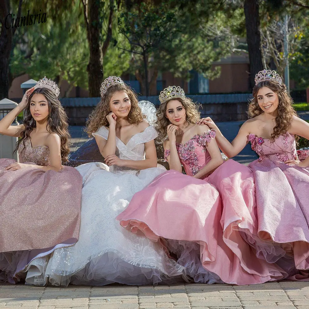 Румяна розовые 3D цветочные платья Quinceanera 2021 блестящие тюлев...