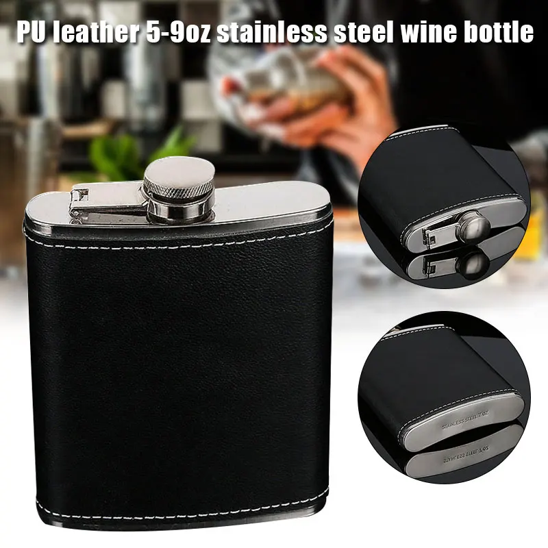Фляжка из нержавеющей стали для виски, 56789 унций, с кожаным держателем