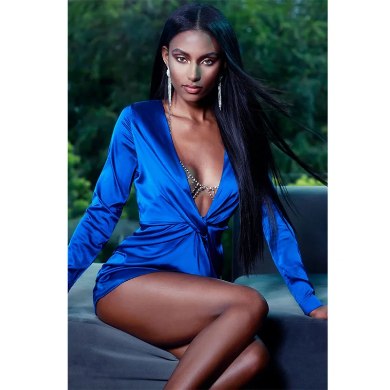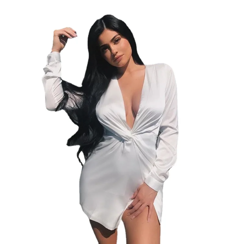 Платье женское атласное с глубоким V-образным вырезом и длинными рукавами