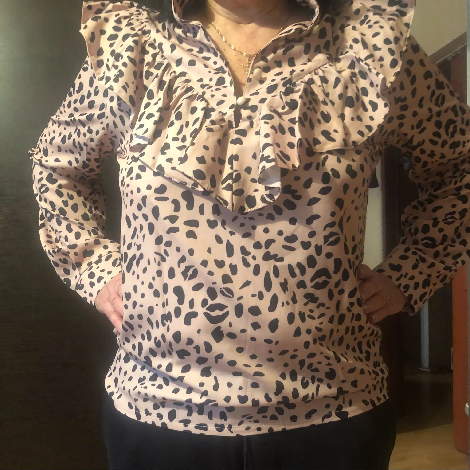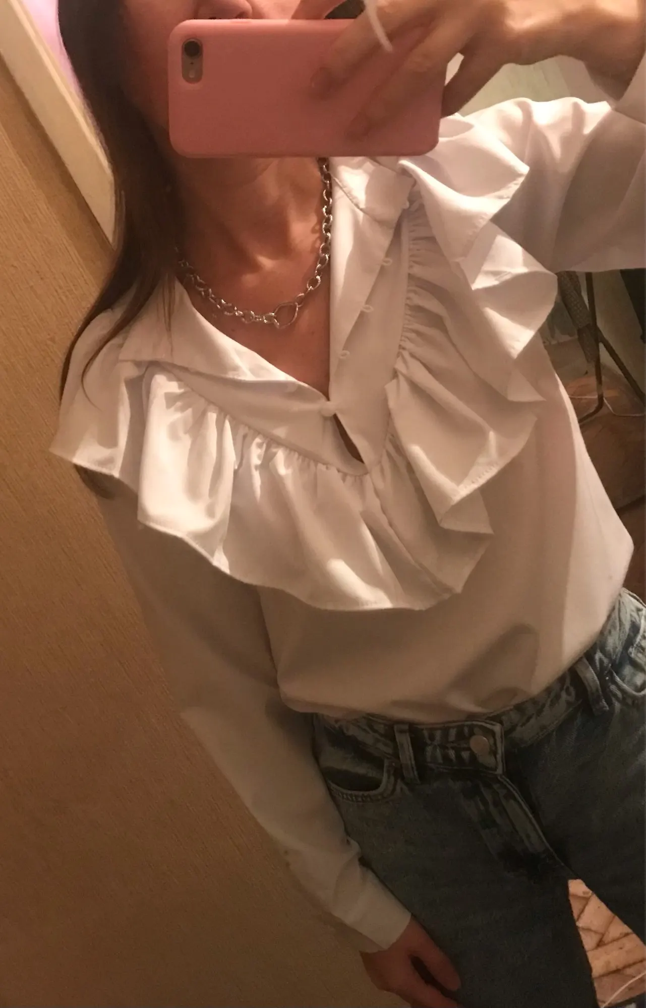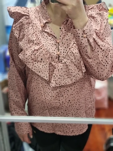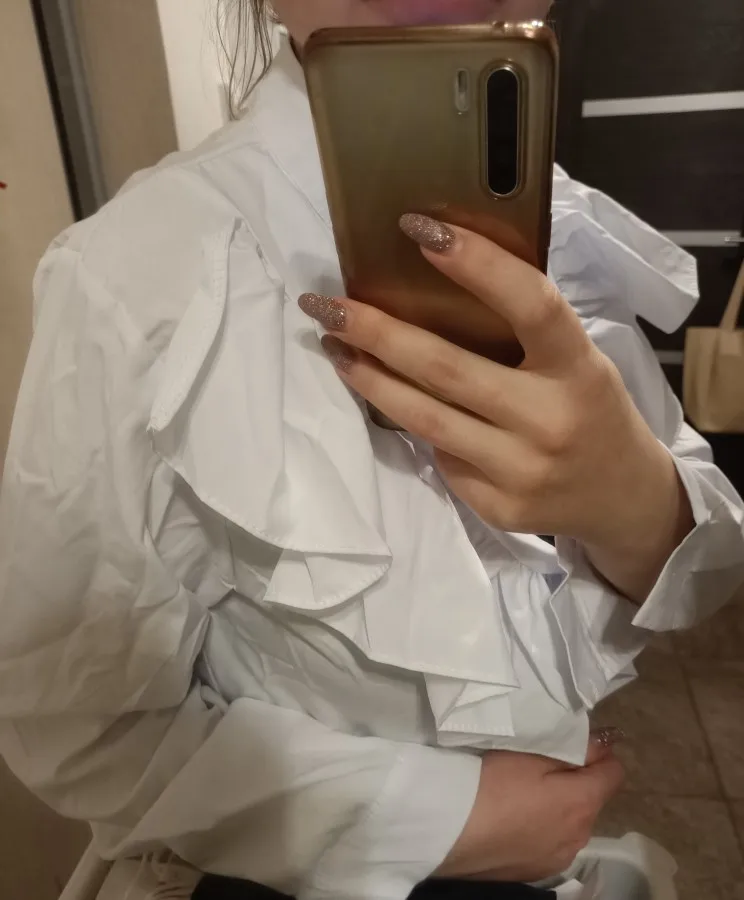 Разочарование. Мне пришла блузка с оборками, пришитыми не до плеч, как это заявлено на фотографиях продавца. Это очень сильно портит впечатление от образа, плечи выглядят опущенными вниз и в принципе выглядит нелепо. Сравните фотографии продавца с реальным товаром. В таком виде носить не буду.