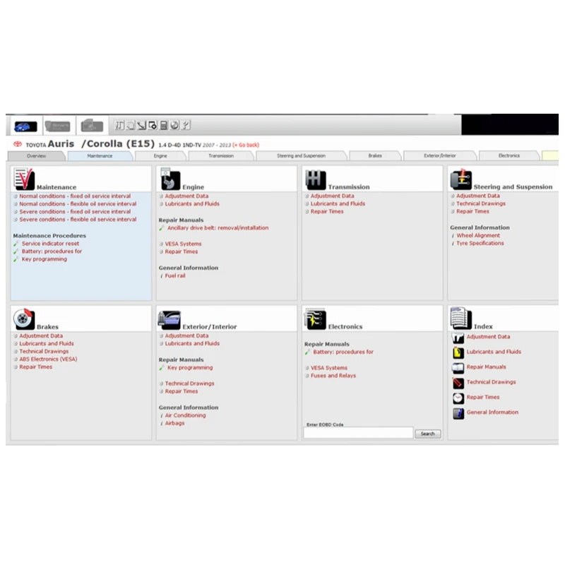 Она берет за основу техническую базу данных Vivid, которая является кодовыми данными транспортных средств Европы полностью. Профессиональная версия включает основную информацию о техническом обслуживании и ремонте, данные настройки, технические чертежи, предохранители и реле, диагностические коды неисправностей и механизм управления данными. Аналогичным образом включаются схемы для электрических систем кондиционирования воздуха.