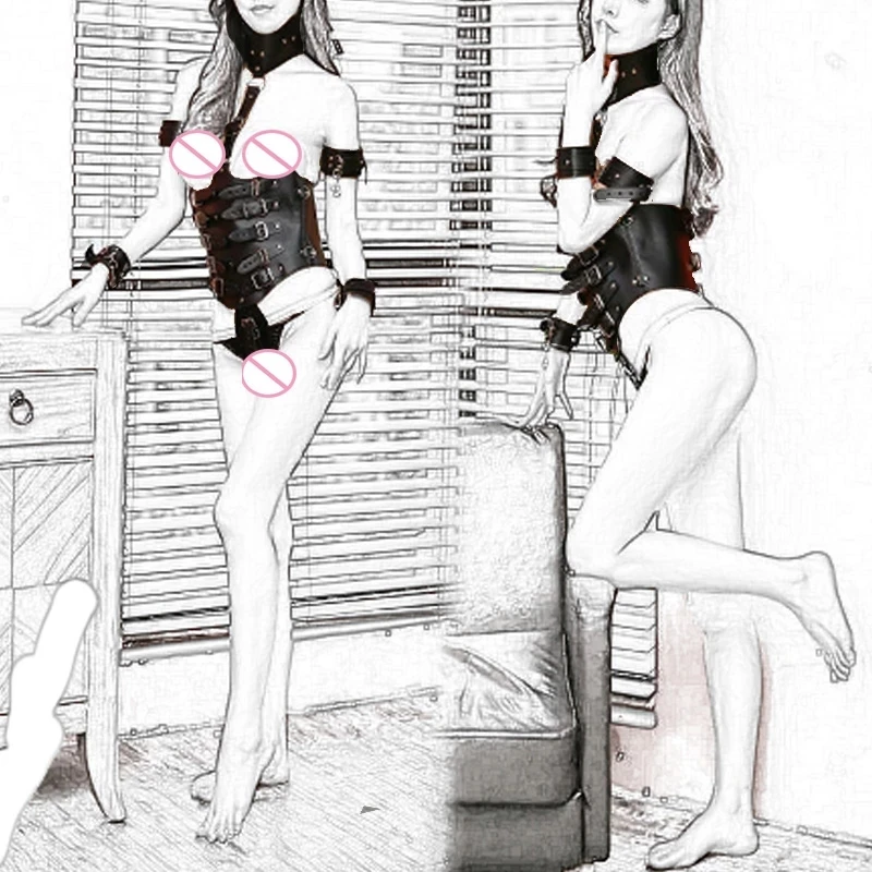 Женский открытый бюстгальтер, кожаный боди с наручниками, воротник, БДСМ, портупея, эротический костюм, рука секс-игрушки для сдерживания