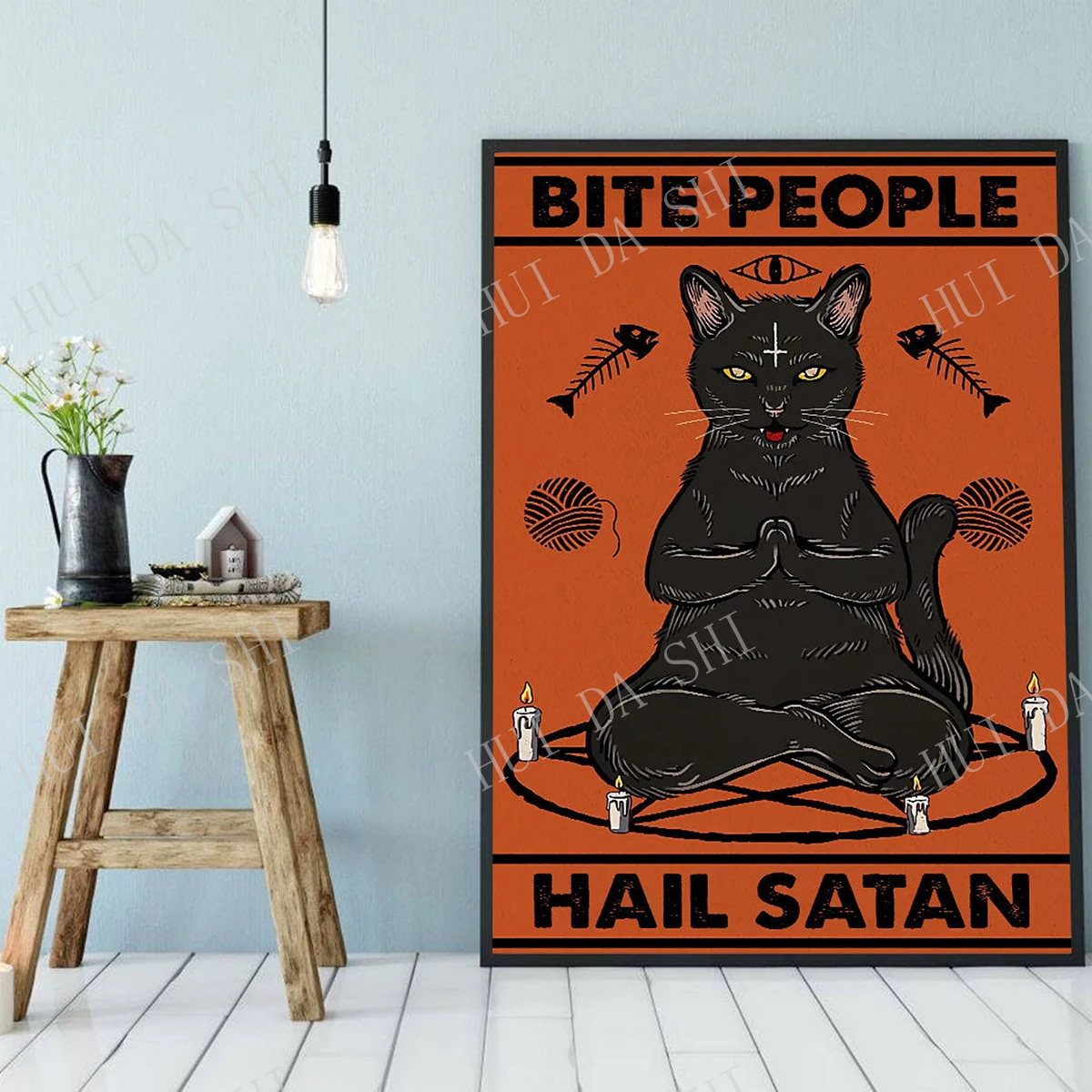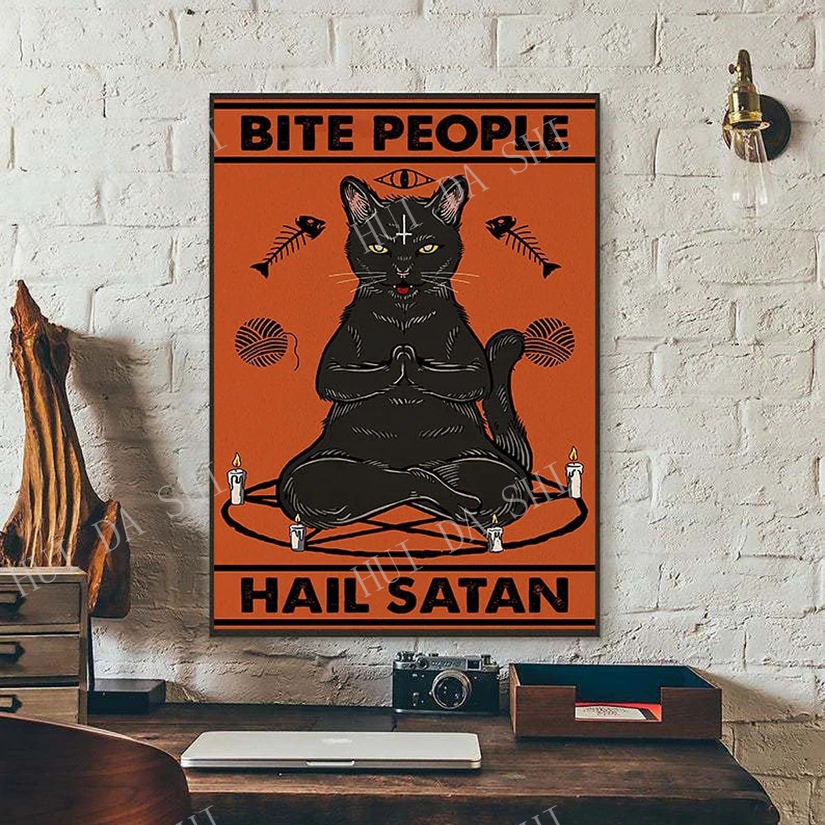 Плакат Bite People с надписью Hail Satan, плакат с черным котом, сатаной, Настенный декор с котом, йогой, готический Кот, художественный принт, подарок для влюбленных кошек