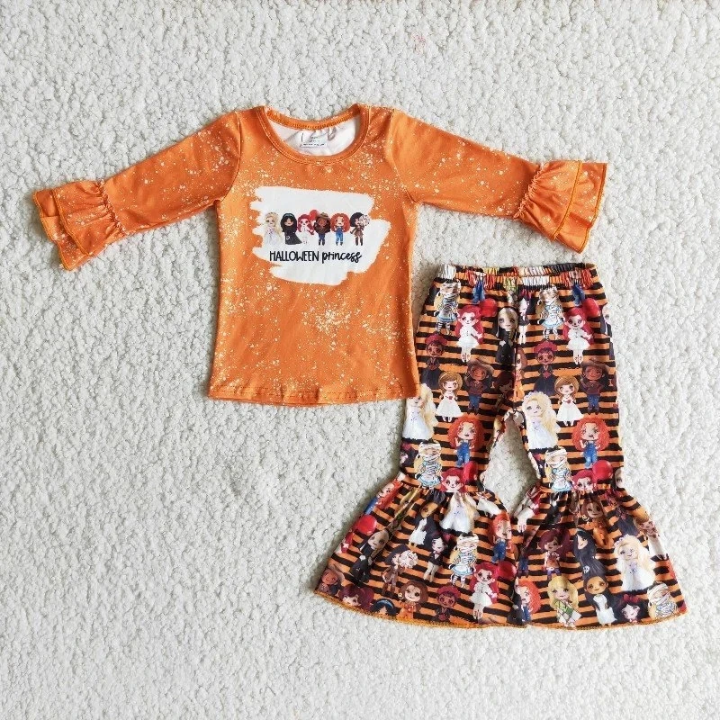 Оптовая продажа, детский комплект одежды на Хэллоуин для маленьких девочек, детская оранжевая рубашка с двойными кружевными рукавами и оборками, штаны с поясом