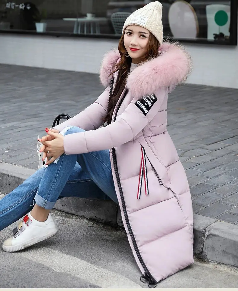 Женское пуховое пальто, длинная приталенная однотонная куртка на молнии с меховым воротником, Женская пуховая куртка, 2019