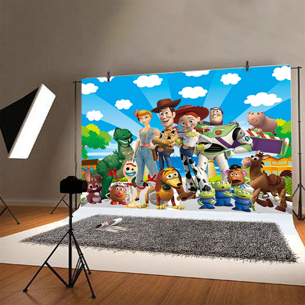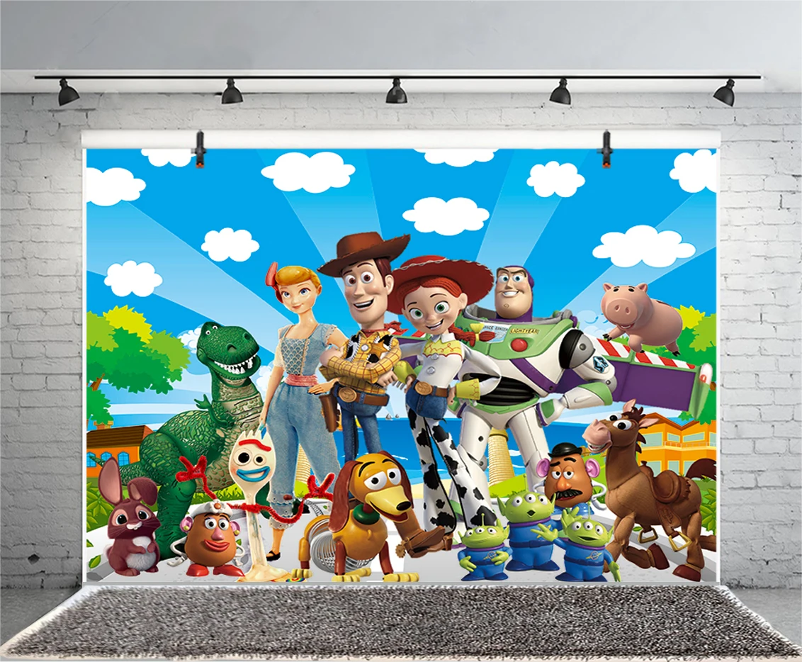 Фон для детских фотографий История игрушек с белыми облаками и баннером