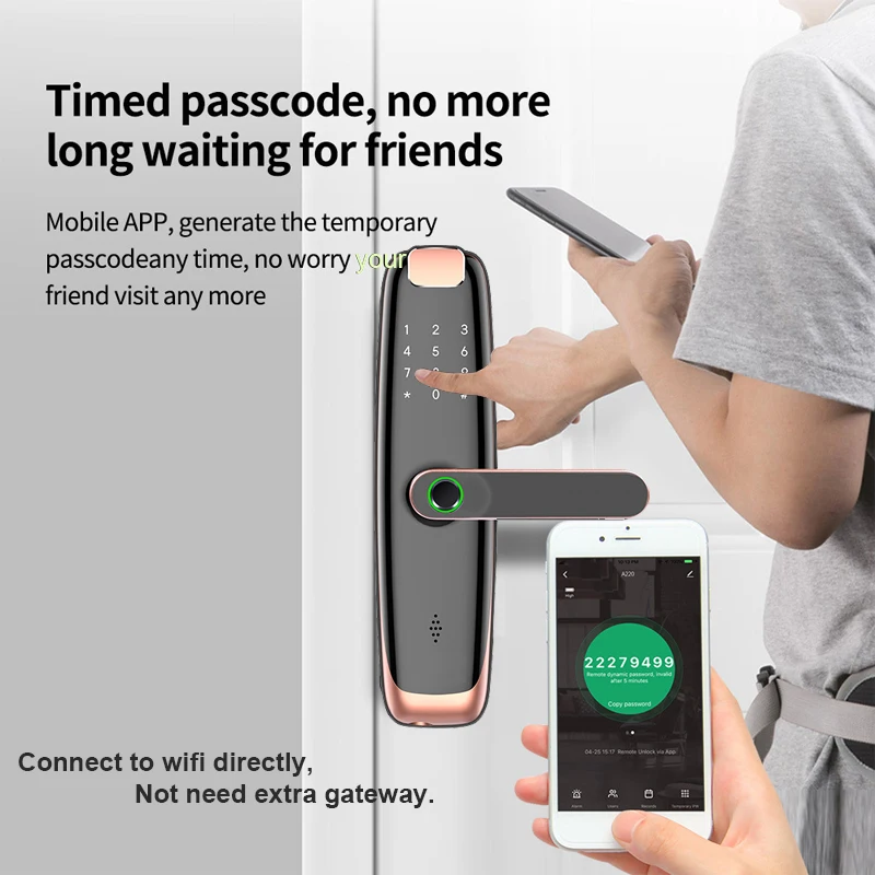 1. Подключение к wifi напрямую, не нужен ни один шлюз;2. Разблокировка удаленно с помощью приложения для телефона;3. Получите запись разблокировки, когда кто-то откроет замок;4. Сделайте временный пароль/пароль по времени в приложении