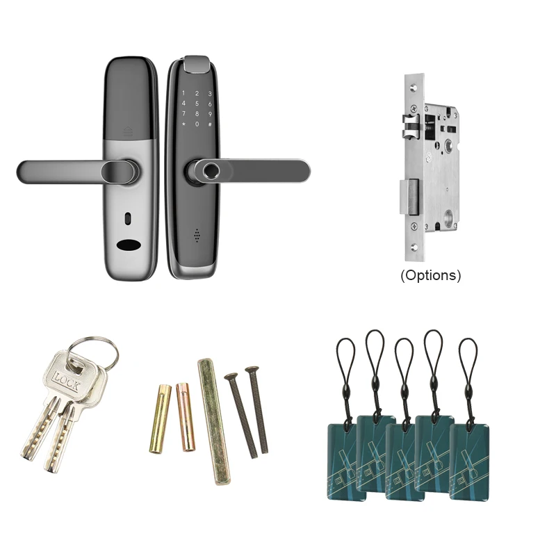 Передняя панель x 1Задняя панель x 1Врезной замок x 1 (варианты)Смарт-карта x 5Механический ключ x 2Комплект винтов x 1
