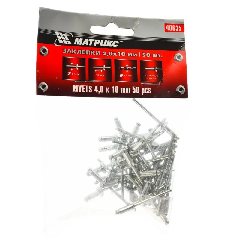 Заклепки 4,0Х10мм 50шт простые Matrix изготовлены из алюминия. Используются при скреплении различных материалов с помощью заклепочников.