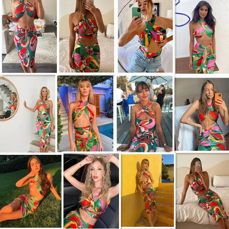 MCLAOSI 2021 сексуальный тренировочный костюм с принтом, женский костюм из двух предметов в стиле бохо, костюм с лямкой на шее, бандажные майки, юбка миди на шнурке, подходящие комплекты