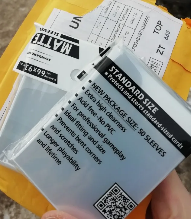 Через 3 недели до метро Ванкувер. Они подходят для магии сбора и Pokemon карт. Они такие же качества, как у Ryker и Ultra Pro sleeve. Обязательно куплю больше в будущем.