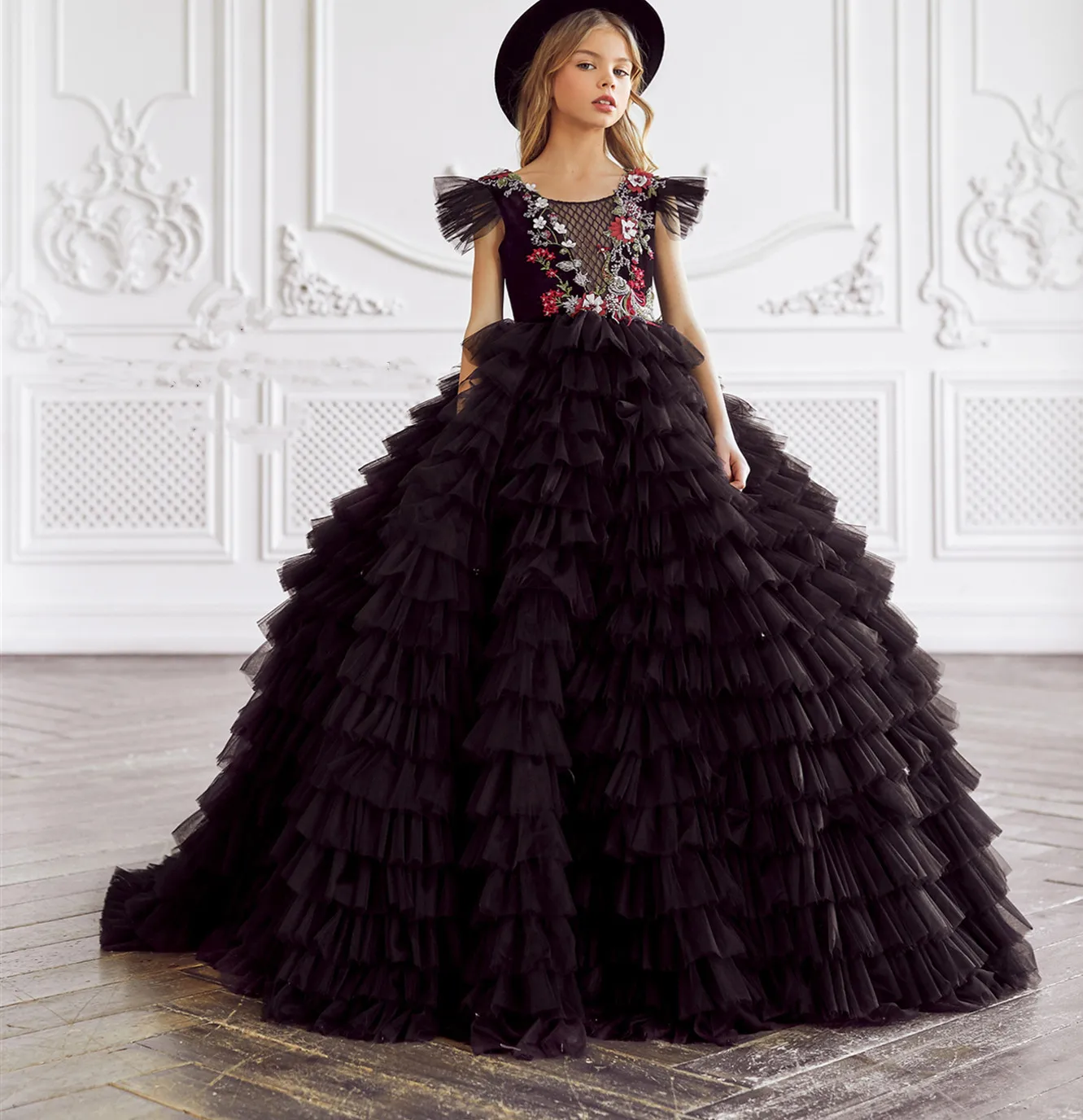 Новинка, черное Тюлевое платье для девочек с цветами в форме облака...
