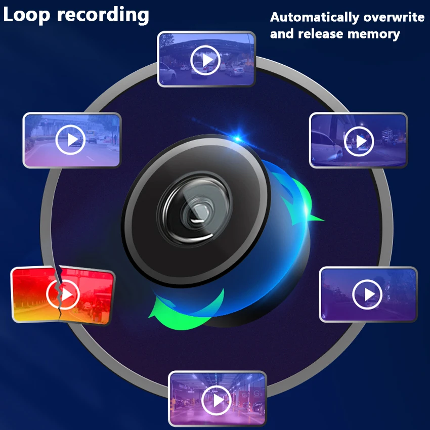 Сразу же Начните циклическую запись после зажигания, не протекающие секунды, экономьте в сегментах, автоматически обнаруживайте место для хранения и автоматически удаляйте перезаписанное видео, когда память заполненаСохранить новое видео, бесшовная петля записи зрения