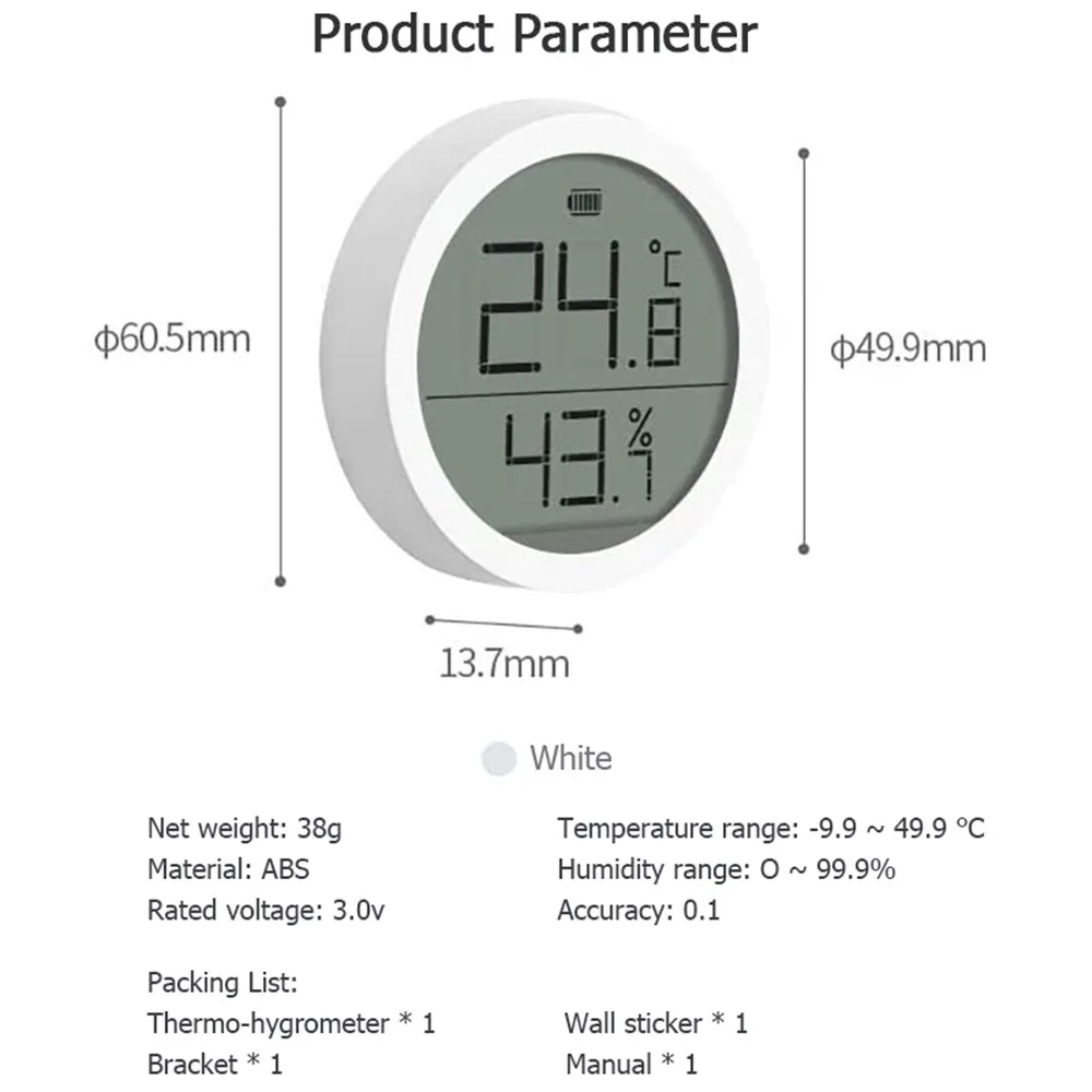 Вес: 38 г (не включая подставку, стикер на стену и батарею)Диапазон температур:-9,9 ~ 50 °CДиапазон влажности: 0 ~ 99.9% RHБеспроводная сеть Bluetooth 5,0