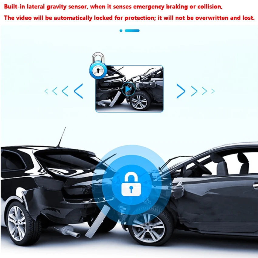 Встроенный боковой датчик гравитации, когда он определяет аварийное торможение или столкновение,Видео будет автоматически заблокировано для защиты; Оно не будет перезаписано и потеряно.