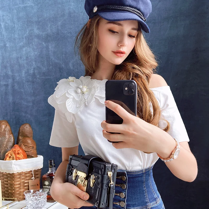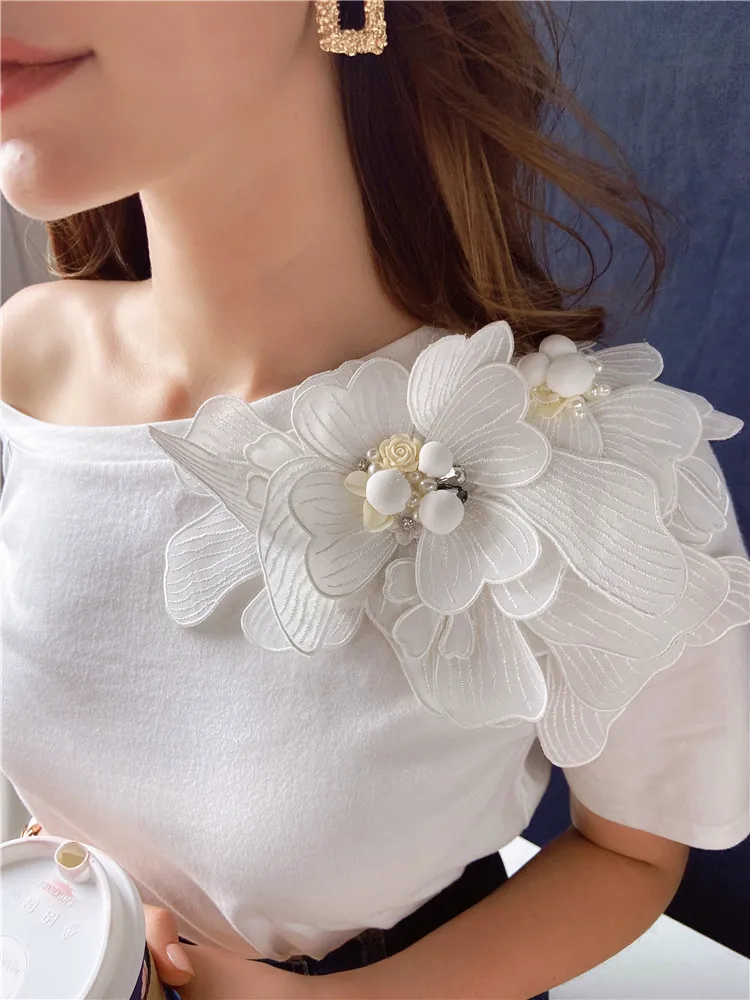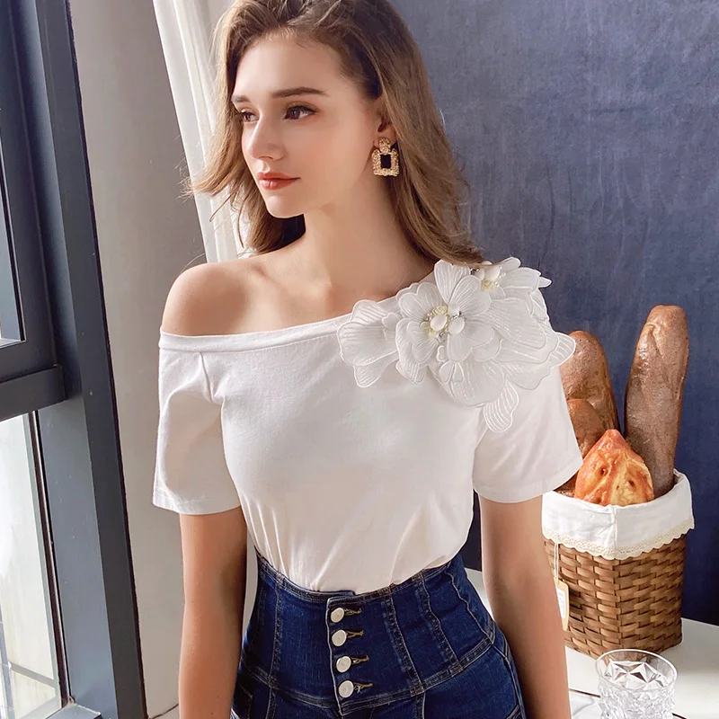 Эксклюзивные летние сексуальные белые футболки Dabuwawa, женские Асимметричные однотонные футболки с цветочным принтом и вырезом, женские топы, DO1BTS014