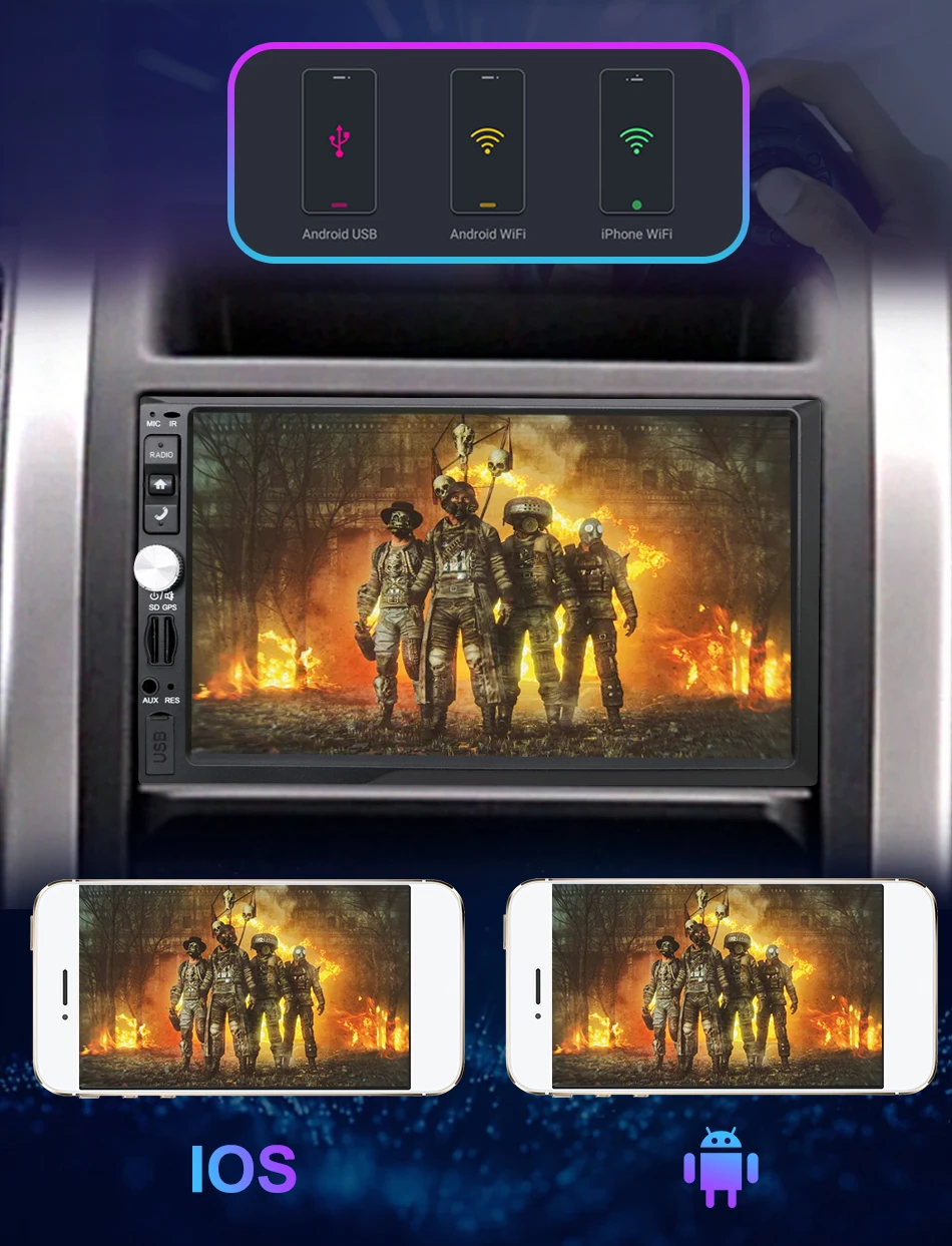 Поддержка зеркальной связи для устройств Android и IOS через usb-кабель или WIFI.