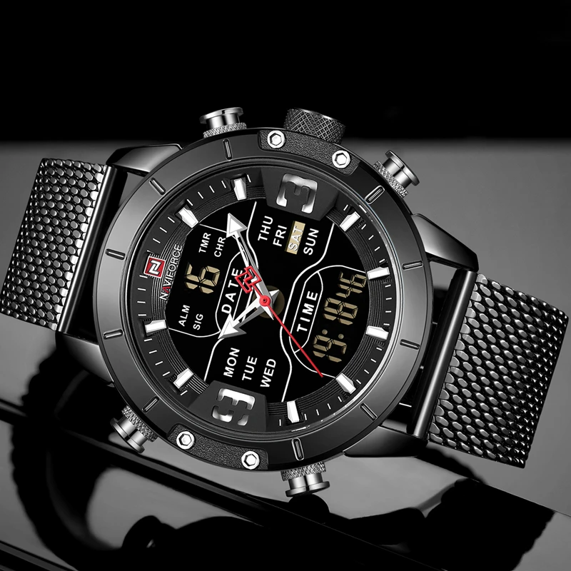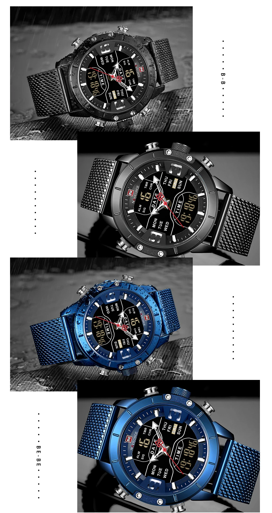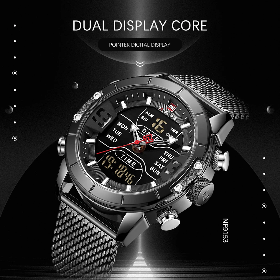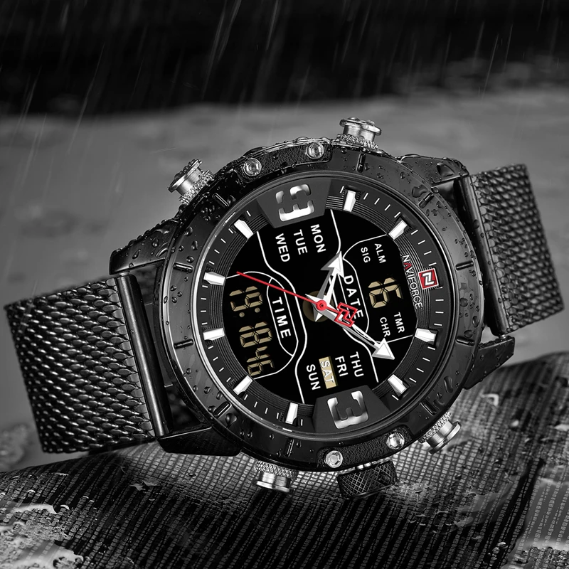 Часы NAVIFORCE мужские с двойным циферблатом, модные повседневные цифровые водонепроницаемые светодиодные, с ремешком из нержавеющей стали, с хронографом и будильником, с отображением недели