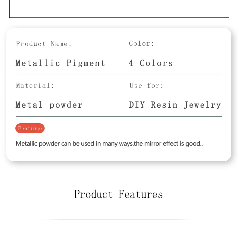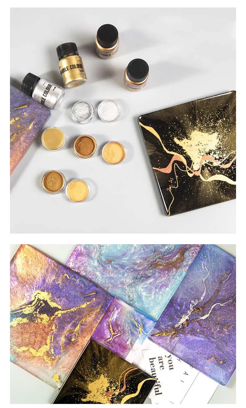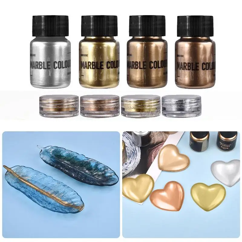 Название: металлический порошок Цвет: серебристый/золотой/красная медь/медное золото * Различные плотности золотых серий и изделий серебряных серий приводят к разному весу, а вес продуктов одного и того же объема отличается. Характеристика: Мраморный металлический пигмент, цвет полон металлической текстуры, Яркий и сверкающий современный fffect пигмент для проектов из смолы. Отлично подходит для изготовления ювелирных изделий из смолы Как использовать: Различные методы буксировки: 1: Смешайте пигмент в вашу смолу, налейте в форму, подождите отверждения, Пожалуйста, обратите внимание, что добавьте небольшое количество к вашему проекту из смолы, и вы можете увидеть результат! 2: Это другой способ, можно использовать его с чернильным жидким пигментом вместе Налейте в форму прозрачную смолу, сначала поместите в нее жидкий пигмент, Налейте в него немного мраморного металлического пигмента зубочисткой, Добавьте этот порошок в нужное вам место, Который может сделать мраморный металлический эффект. Упаковочный лист: 1 бутылка пигмента