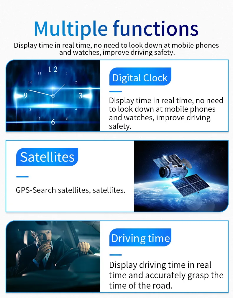 Информация о GPS:Скорость транспортного средства (км/ч или миль/ч), напряжение батареи, время поездки, расстояние поездки, часы, направление движения, высота, gps спутниковые номера