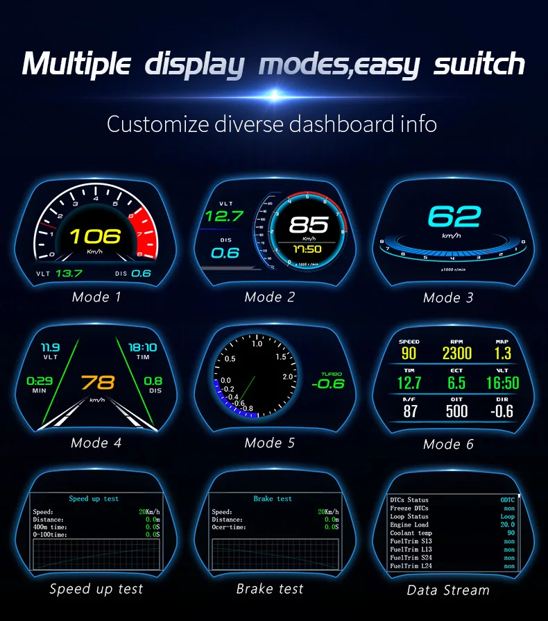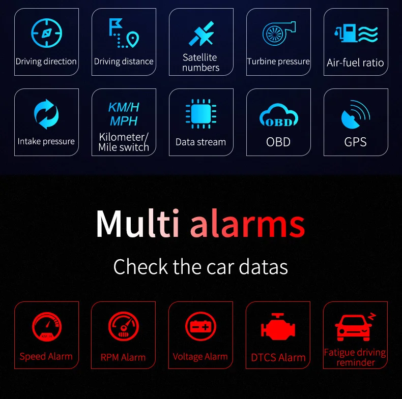 Функции OBD:Скорость транспортного средства (км/ч или миль/ч), об/мин двигателя, температура воды (°C или °F), напряжение батареи, часы, расход топлива, расстояние поездки, время поездки, ODO метр, часы, километры на литр, температура масла, давление турбины, воздушное топливо Соотношение, Входное давление, gps спутниковые номера, высота, направление движения, тест на скорость, испытание тормозов, отображение подробного кода неисправности в текст, и очистка кода неисправности, и 48 профессиональная Дата Поток