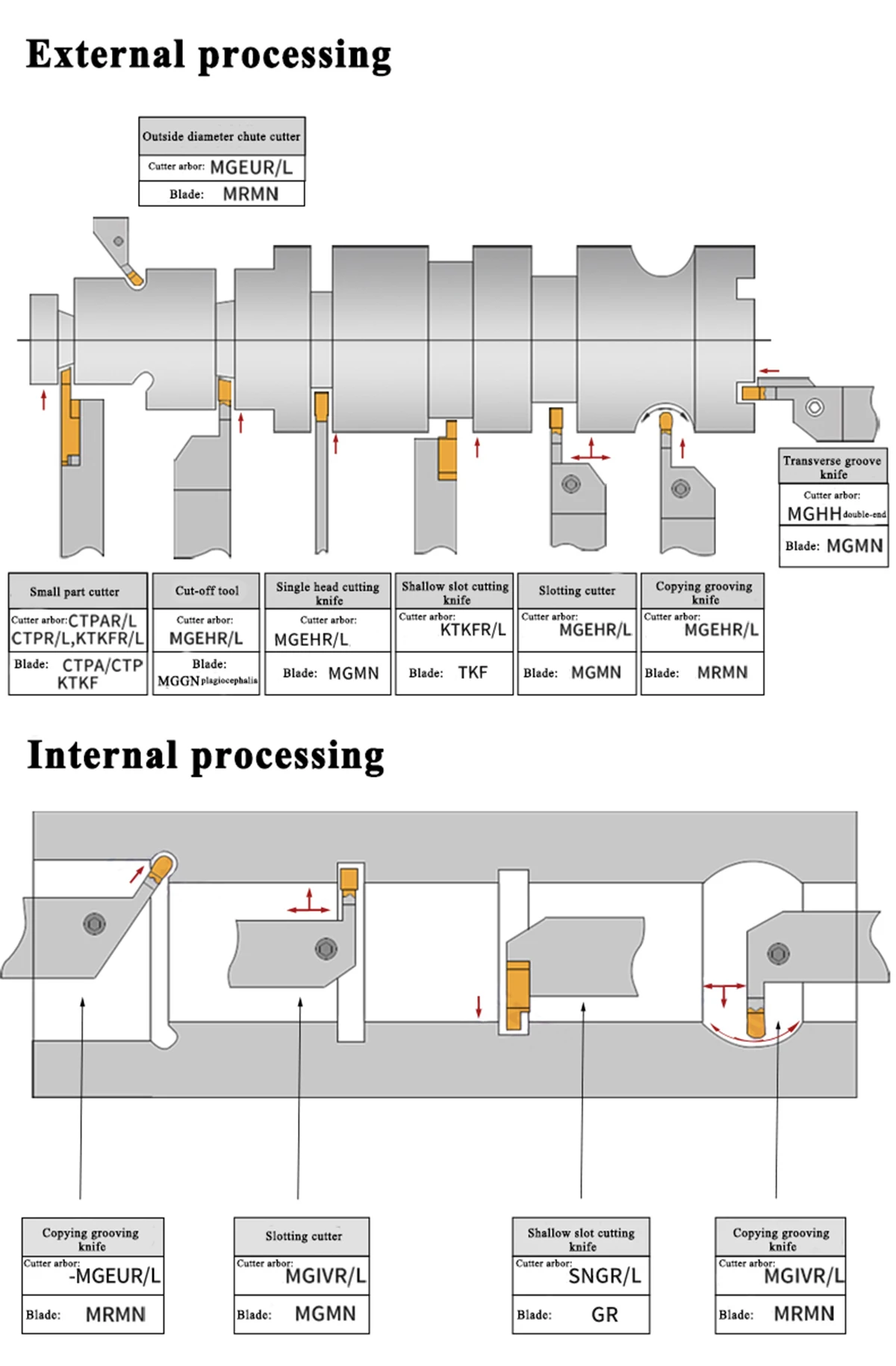 Например: MGIVR2520-31. «MGIV» означает: инструмент для обработки канавок обычного внешнего диаметра, выбирается в соответствии с требованиями к обработке канавок2. «L» означает Левый нож, с моделями «L» и «R»3. Первый «25» представляет собой минимальную апертуру обработки, высокий выбор в соответствии с токарным центром4. Вторая «20» означает ширину корпуса ножа5. «3» означает: ширину лезвия, выбираемую в соответствии с шириной пазаНаконец, о словосочетании: «3» для инструментальной планки MGIVR2520-3 означает «300» для blade MGMN300