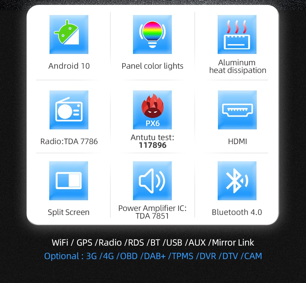 OBD/DAB/3G/4GSupport(OBD scanner,DAB box,(3G/4G dongle optional)