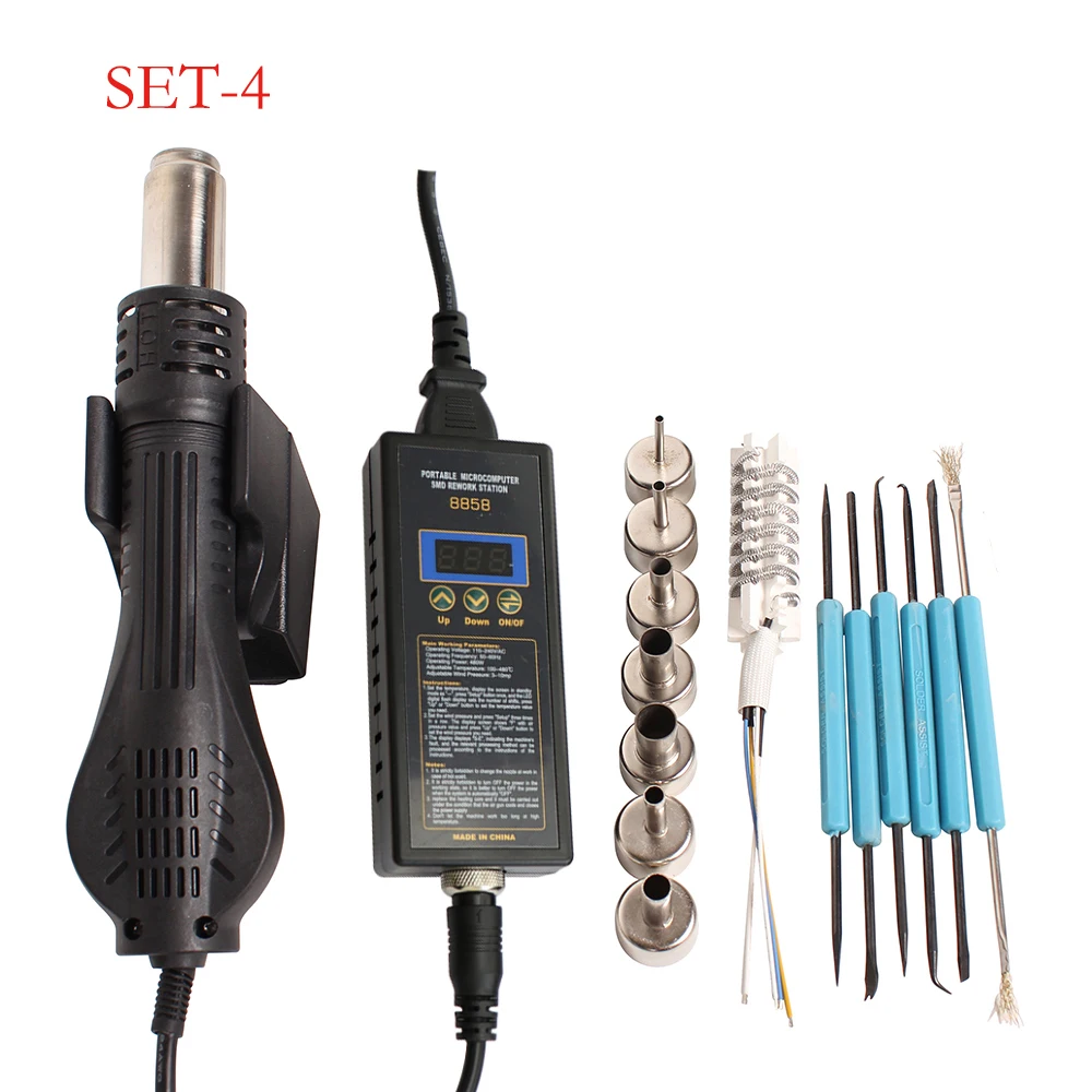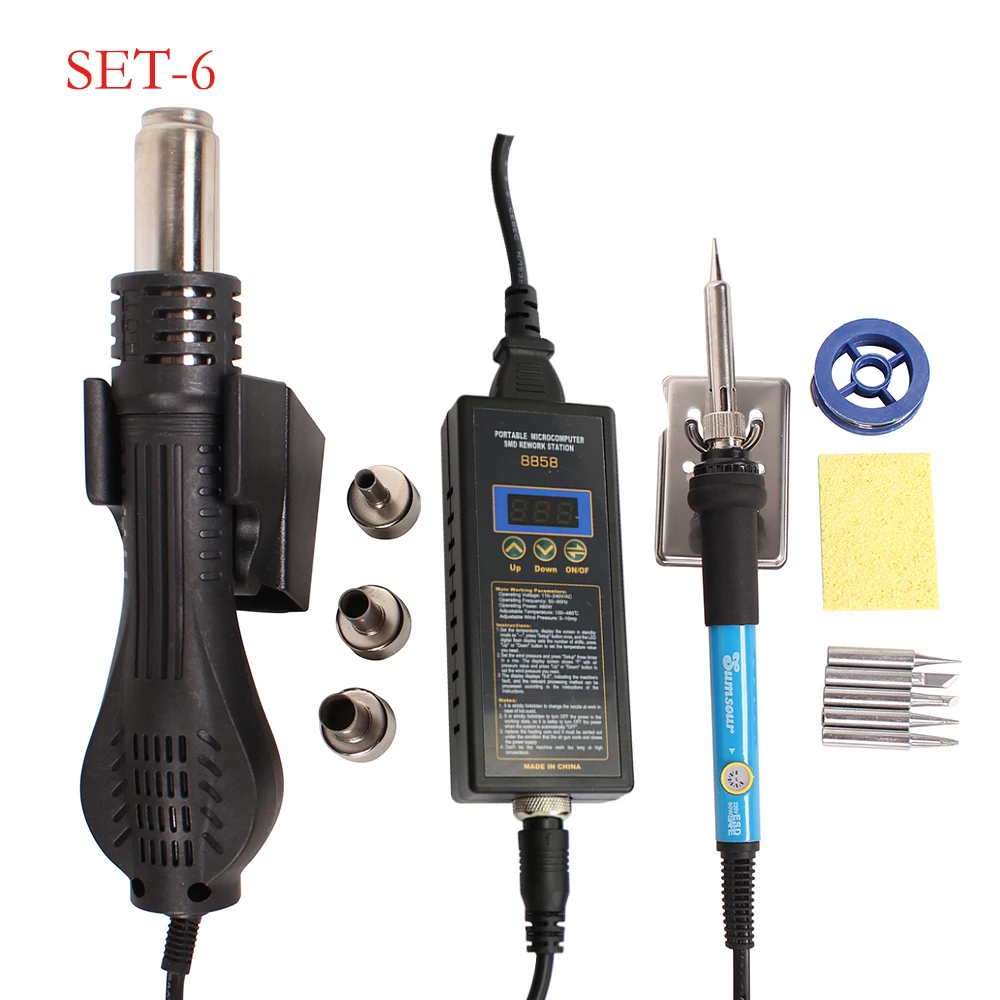 1 х 8858 контроллер1 ручка для термофена1 х держатель пистолета1 x Кабель Питания7 насадок1 керамический нагреватель1 x вспомогательные инструменты для пайки 6-в-1