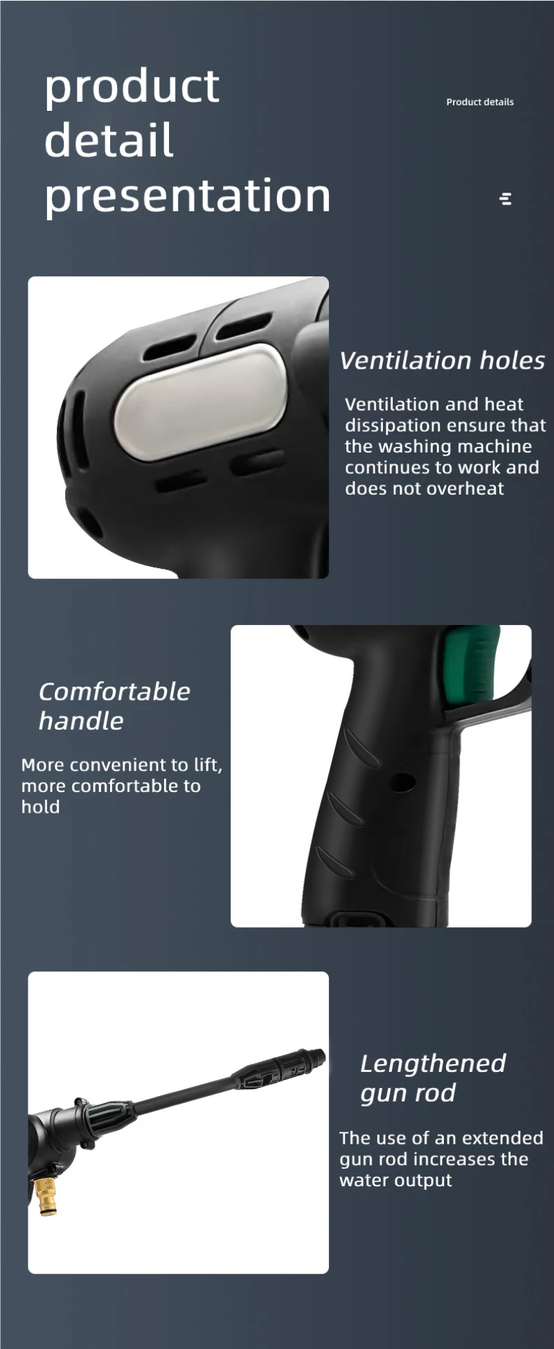 1. Беспроводная Автомобильная стиральная машина не ограничена длиной провода.2. 750 серий моторов, мощный 400 Вт медный мотор, двигатель из чистой меди, более длительный срок службы3. Различные режимы воды можно переключать, три метода распыления4. 20000 ОБ/мин скорость может работать непрерывно, долгий срок службы5. Диапазон давления воды высокой интенсивности до 12 метров6. Прочная литиевая батарея, длительный срок службы батареи, можно мыть три автомобиля одновременно7. Высокоэффективная литиевая батарея, с пятью основными защитой: перезарядка, перезарядка, Перегрузка по току, температура и короткое замыкание8. Многофункциональная Очистка высокого давления, очень подходит для мытья автомобиля, полива сада, орошения сельского хозяйства и ежедневной очистки9. Съемный аккумулятор, отдельная зарядка, безопасный и эффективный10. Простота установки и простота в использовании