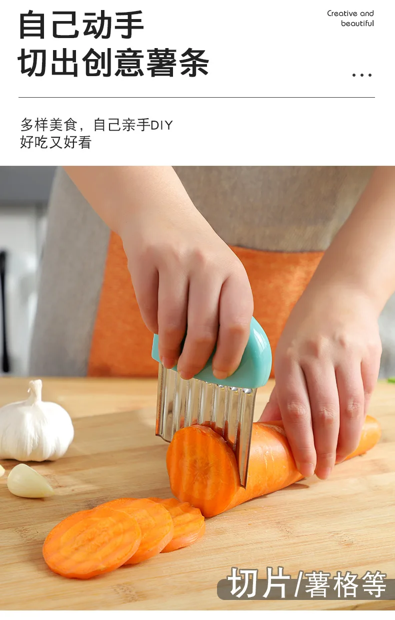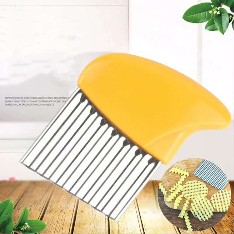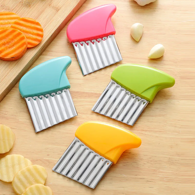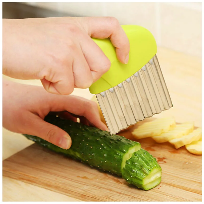 Shred и ломтики лука, картофеля, ломтики мятого картофеля фри, салата, нарезанные ломтики картофеля, кухонный нож
