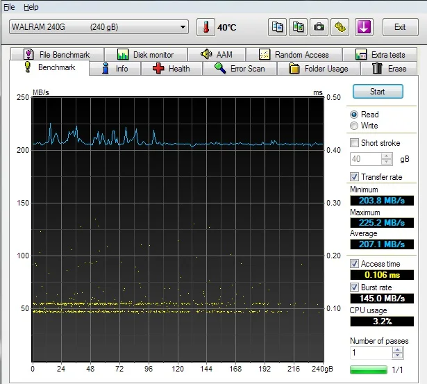 Накопитель не очень быстрый, но в рамках этой цены - нормально. Вряд ли удастся найти в этой ценовой категории - что то быстрее. Измерения проводились при подключении к SATA3 на материнской плате. Остальное - в скриншотах.