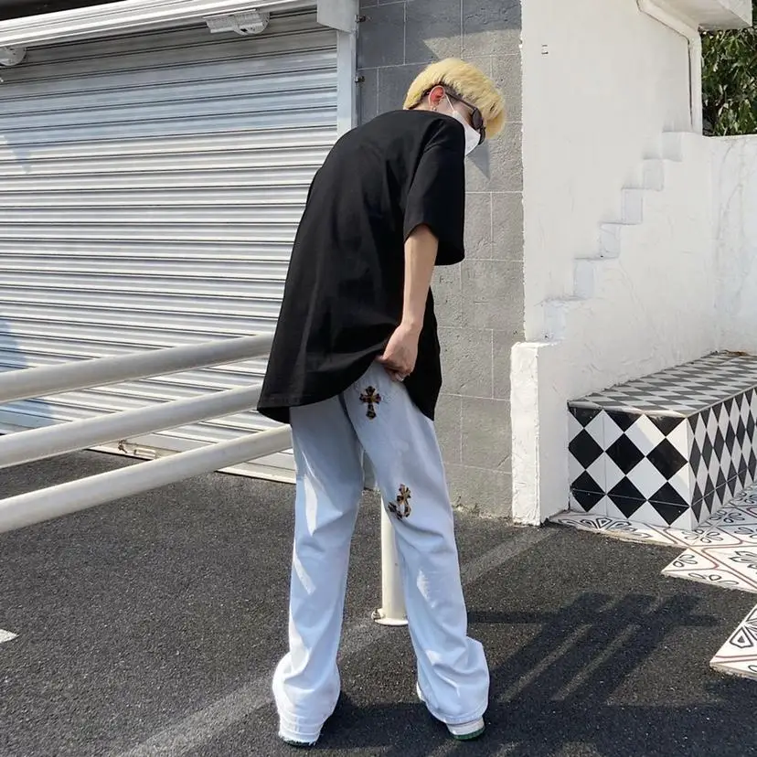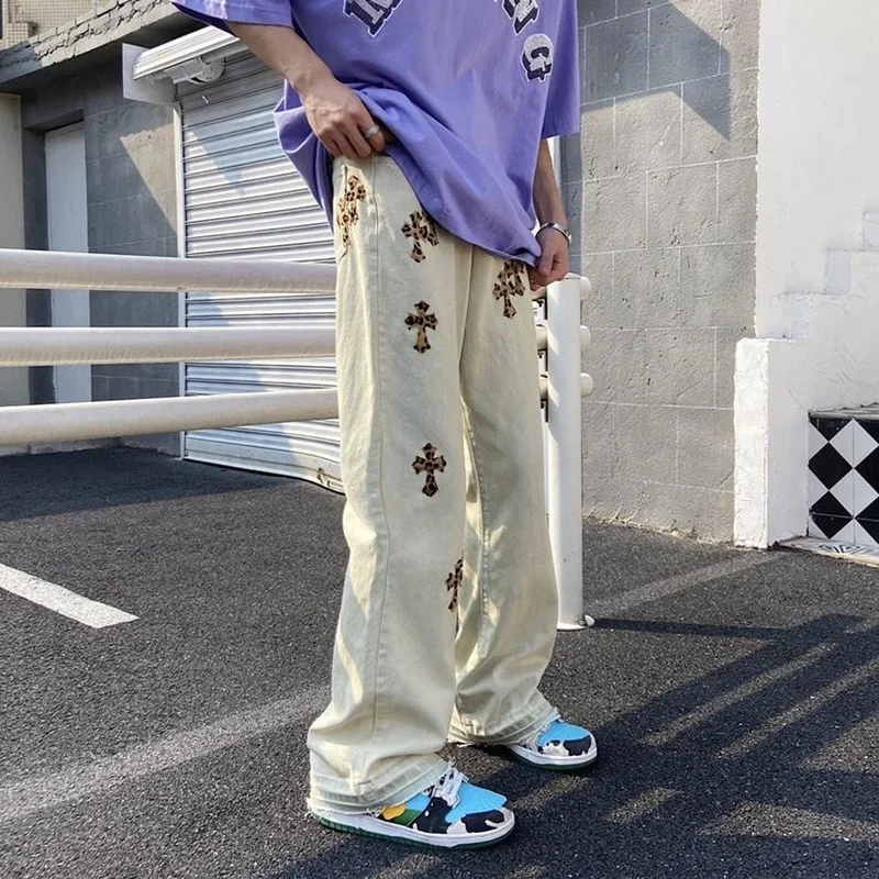 Мужские и женские прямые джинсы с вышивкой крестом, широкие мешковатые брюки-клеш в стиле хип-хоп, 2021