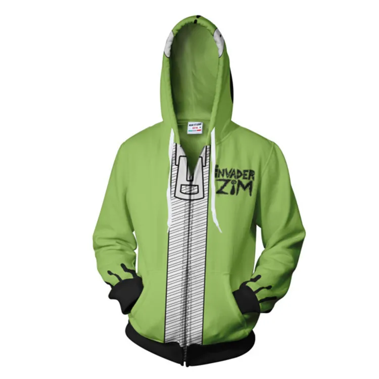 Костюм для косплея аниме Invader Zim, костюм инопланетянина, толстовка с капюшоном на молнии 3D, уличное повседневное пальто, Свитшот