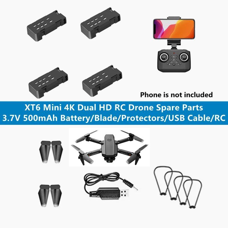 Название позиции: XT6 4K Selfie RC Дрон, запасные части, 3,7 в, 500 мАч, протекторы пропеллера, USB-кабель RC