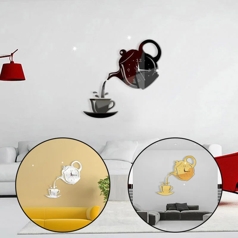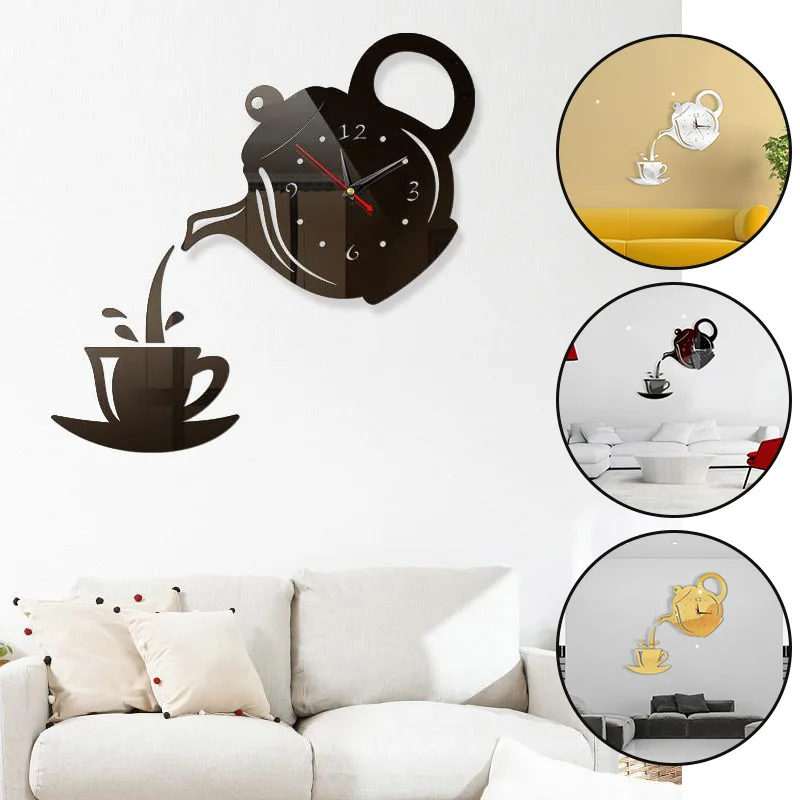Акриловая Зеркальная Наклейка на стену, креативный чайник, настенные часы, самоклеящаяся Водонепроницаемая наклейка для украшения мобильного дома
