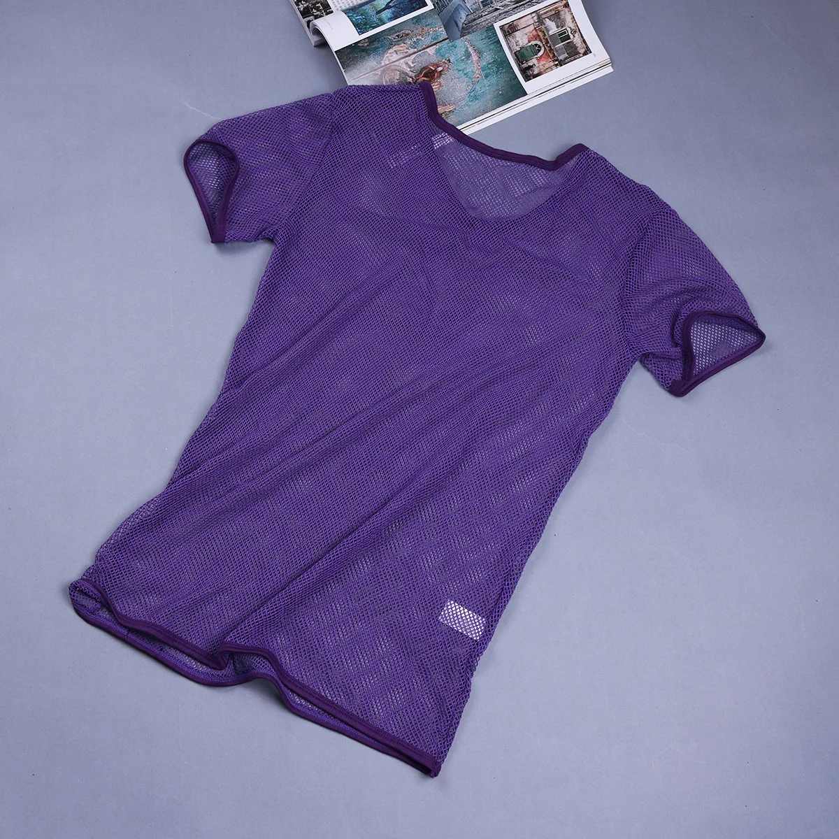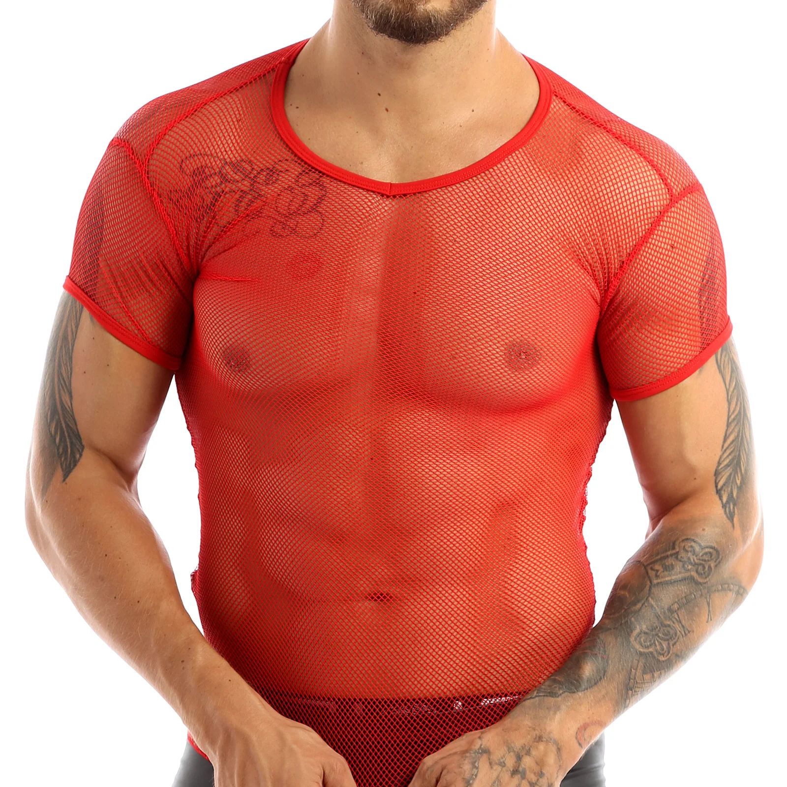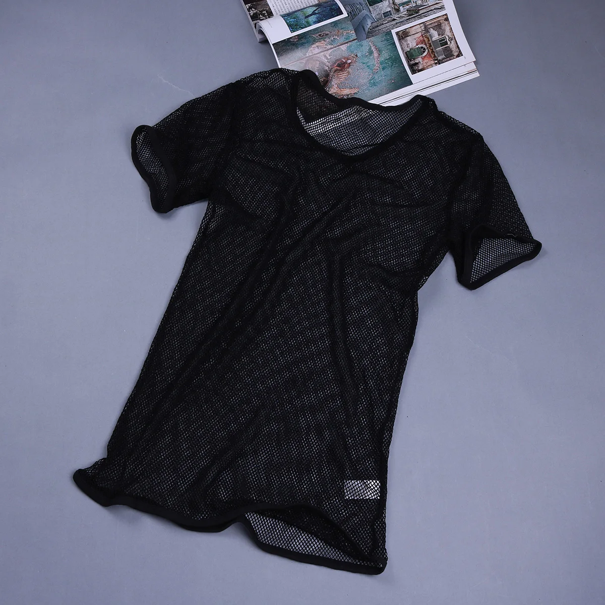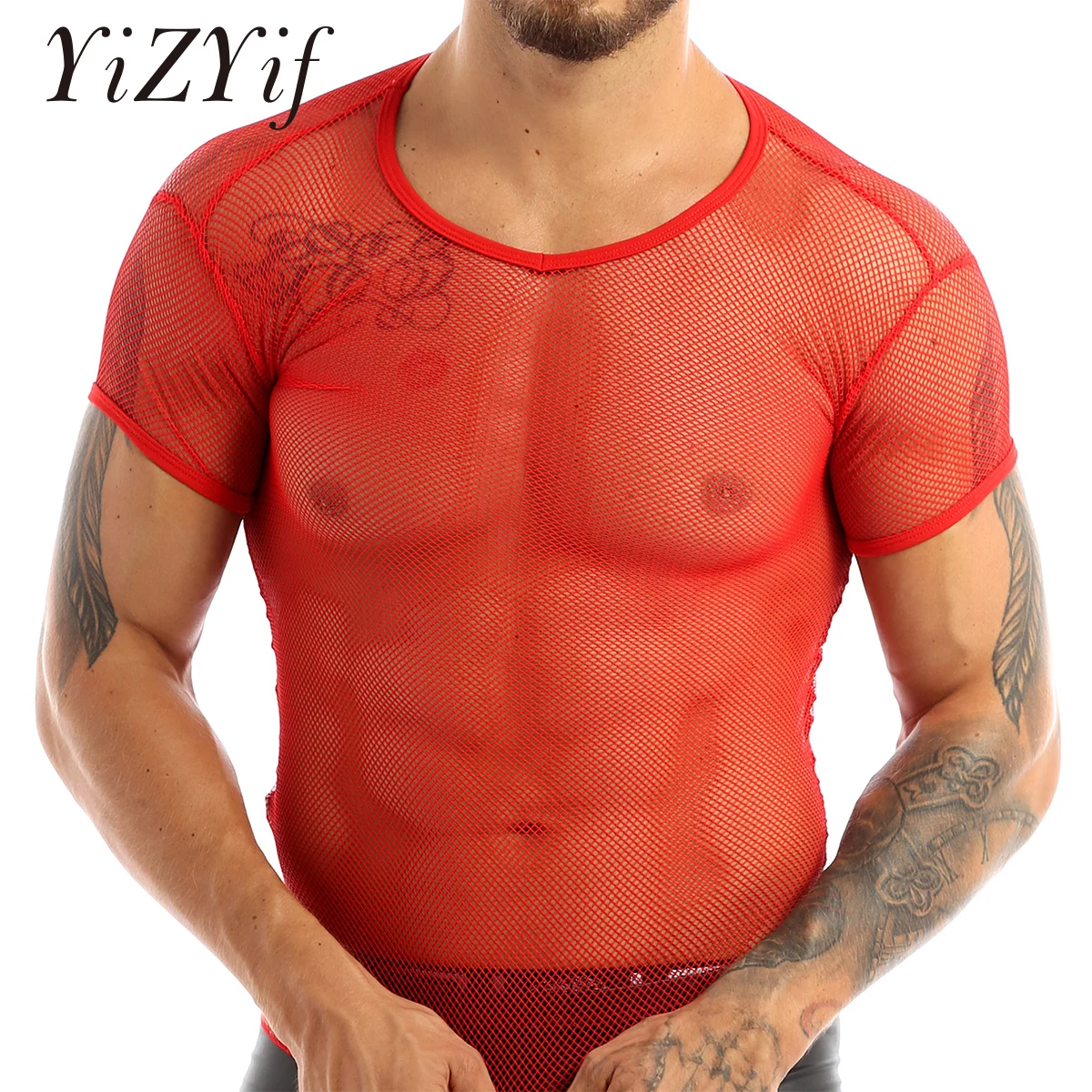 Мужская сексуальная сетчатая прозрачная рубашка с коротким рукавом, Клубная одежда для ночного клуба, Прозрачная майка, топы, рубашка, костюм, футболка в сеточку