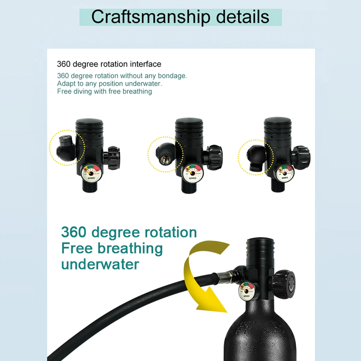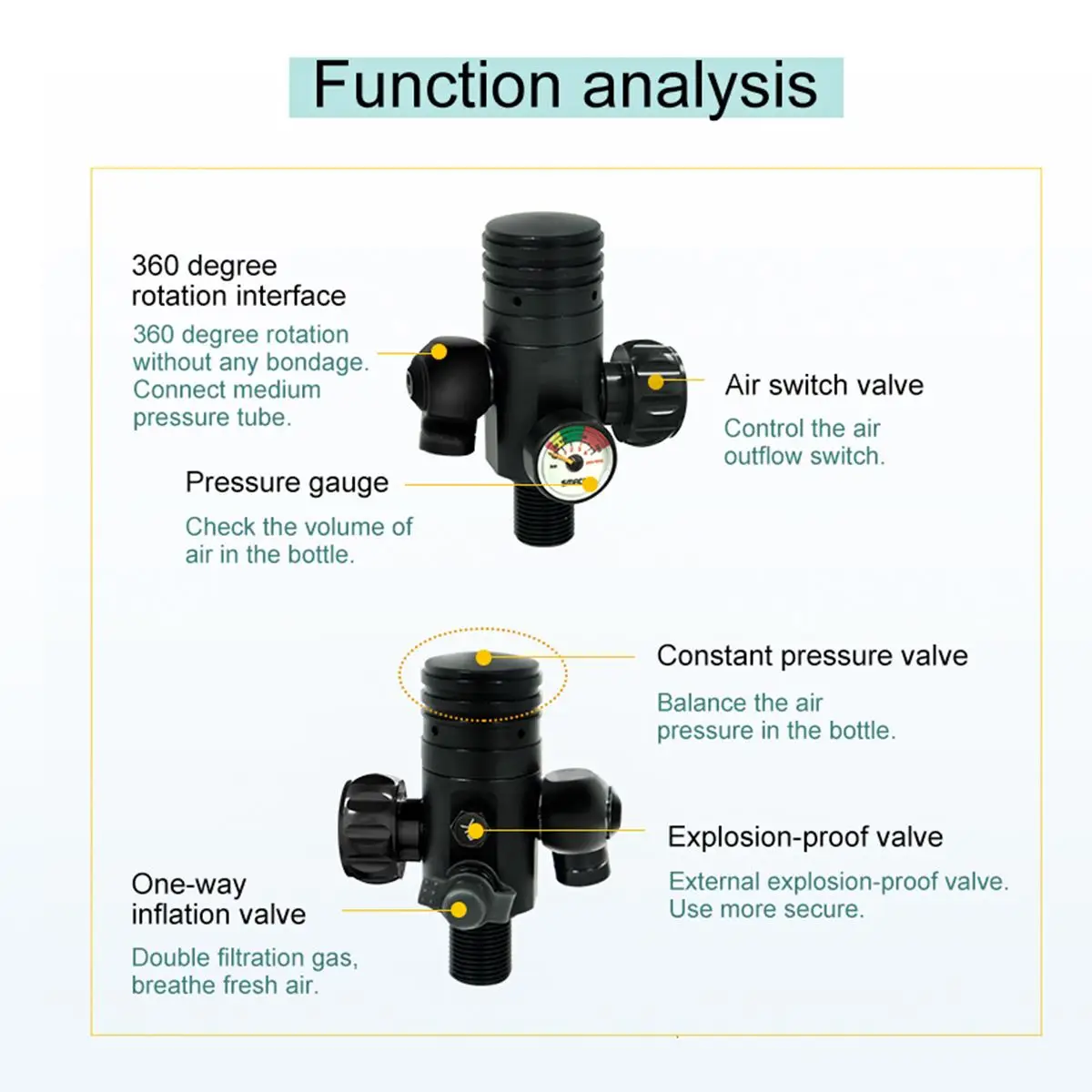 Применение:1Л кислородный баллон + воздушный шланг среднего давления + вторичный дыхательный клапан + понижающий клапан первого уровня