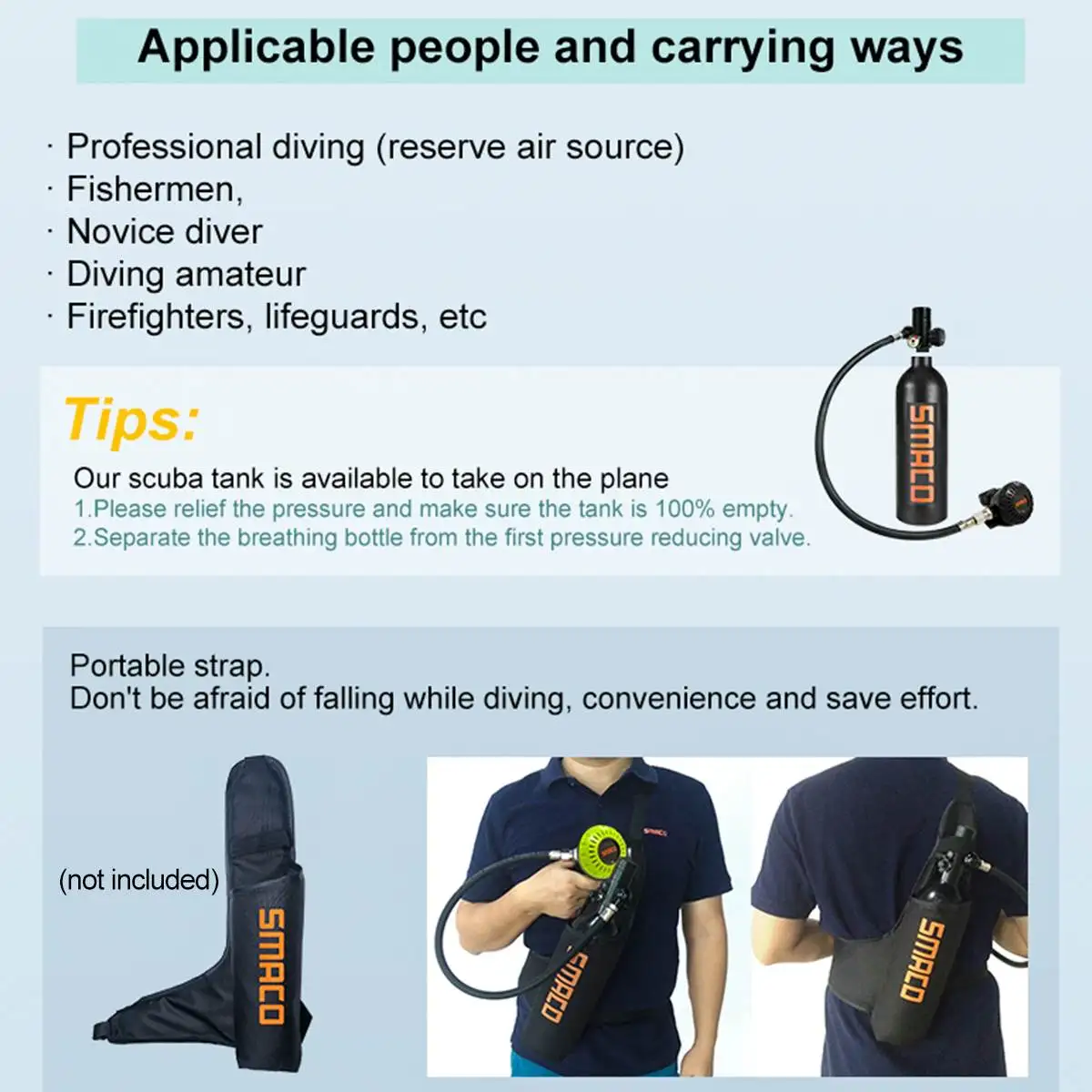 Предупреждение:Перед чтением и пониманием инструкций и заметок не используйте эту информацию.1. Этот продукт подходит для отдыха и дайвинга в пределах 10 м. Не пытайтесь использовать его в качестве источника воздуха в глубокой воде.2. Этот продукт может быть использован в качестве резервного источника воздуха для отдыха дайвинга в пределах 30 метров.3. Этот продукт подходит для воды выше 10 ℃ Цельсия.4. Надуйте продукт перед использованием и проверьте повреждения или утечки. Никогда не используйте предметы, которые повреждены, протекают или демонстрируют признаки ошибки в производительности.5. Максимальное давление наполнения этого продукта составляет 3000 фунтов на кв. дюйм или 200 бар и может только заполнить сжатый воздух, который дышит человеческое тело. Газы с содержанием кислорода более 40% не могут быть использованы.6. Держите продукт в прохладном сухом месте вдали от прямых солнечных лучей. Не храните в багажнике автомобиля или при высокой температуре или не ставьте его в огонь.7. После наполнения воздуха, давление должно быть сначала выпущено.8. Когда указатель указателя достигает Красной области, пожалуйста, Поднимитесь на поверхность, надуйте снова для использования.9. Аварийное оборудование должно быть использовано в аварийной ситуации. Этот продукт не обеспечивает защиту в случае опасности.10. При первом использовании, пожалуйста, Потренируйтесь в мелководье.
