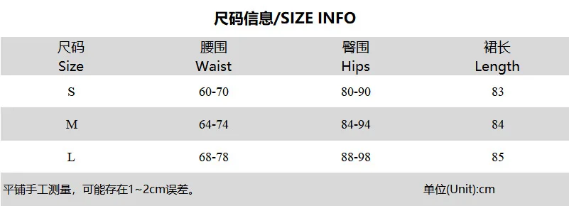 Таблица размеров:Размер (см)S Талия: 60-70 Бедра: 80-90 Длина: 83М Талия: 64-74 Бедра: 84-94 Длина: 84L Талия: 68-78 Бедра: 88-98 Длина: 85Размер (дюймы)S Талия: 23,62-27,56 Бедра: 31,5-35,43 Длина: 32,68М Талия: 25,2-29,13 Бедра: 33,07-37,01 Длина: 33,07L Талия: 26,77-30,71 Бедра: 34,65-38,58 Длина: 33,46Дружеские советы:1. Из-за ручного измерения возможны отклонения в 1-3 см.2. Обратите внимание, что разница светильник цвете s возможна из-за светильник щения и экрана. Спасибо.Содержимое упаковки1 юбка