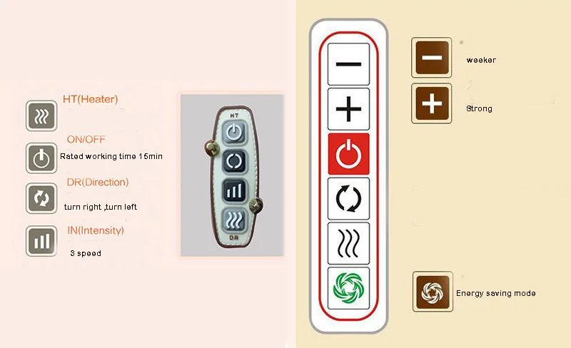 Входное напряжение: 100-240 В; 50-60 ГцВыходное напряжение: 12 ВМощность: 25 ВтЗакройте выходной порт адаптера питания к вилка-стимулятор. При использовании в автомобиле выходной порт прикуривателя закрывается на вилка-стимулятор.На переключателе панели управления. Стимулятор начинает работать.Нажмите кнопку направления, головки стимулятора неоднократно вращаются в обратном направлении.Нажмите инфракрасную кнопку, Запустите функцию инфракрасного нагрева.После использования Включите стимулятор.