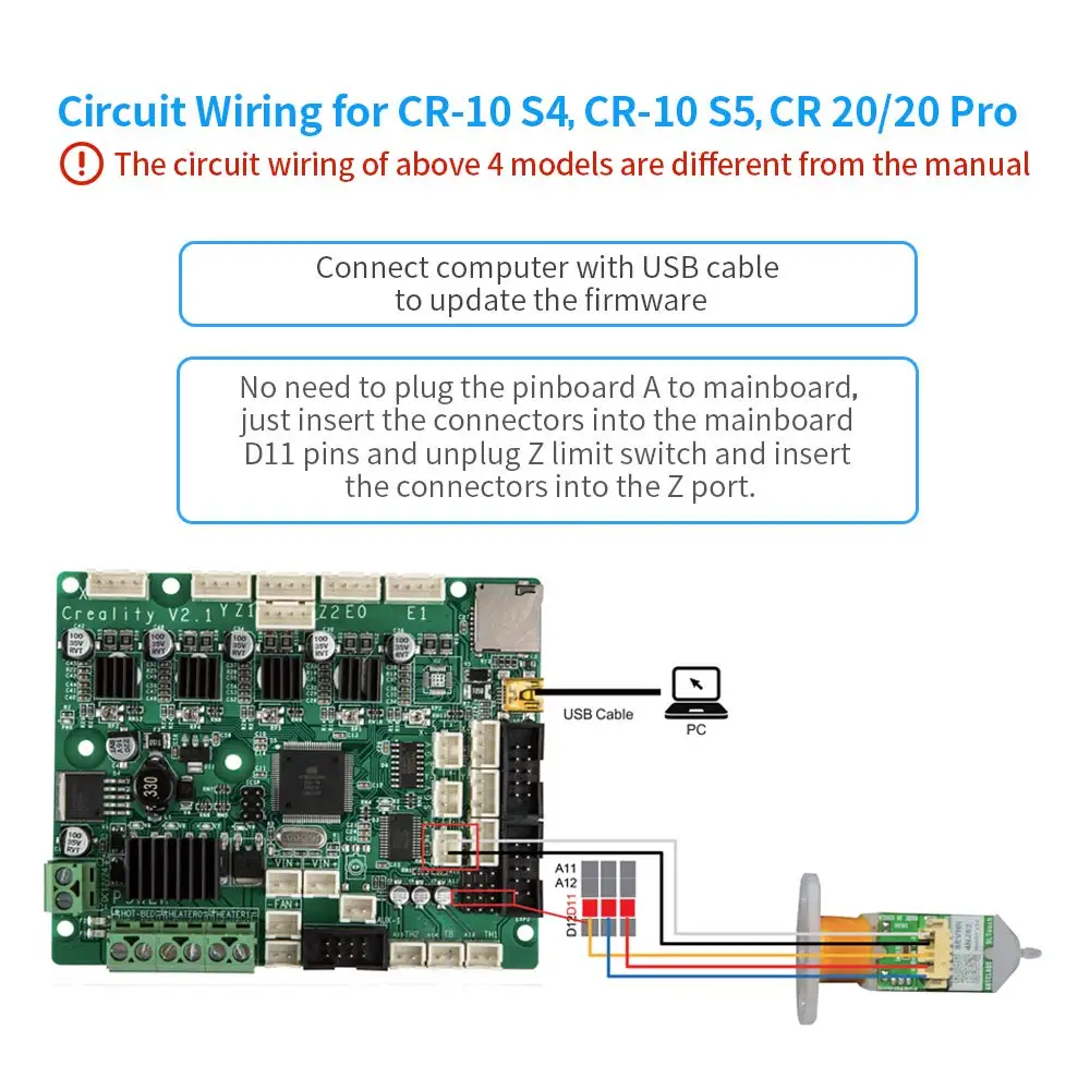 2. Нет необходимости подключать плату A к материнской плате CR-10 S4, CR-10 S5, CR 20, CR20 Pro, просто вставьте разъемы в контакты материнской платы D11 и отсоедините концевой выключатель Z, затем вставьте разъемы в порт Z.