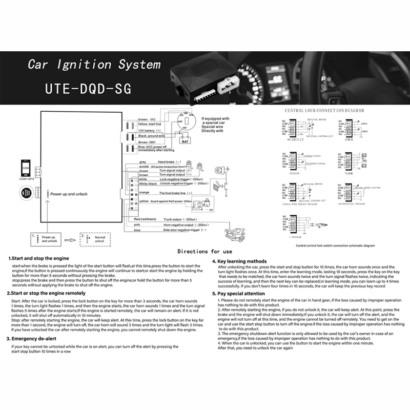 1. Используйте свой телефон, чтобы разблокировать или заблокировать автомобиль2. Используйте свой телефон для запуска или остановки двигателя3. Запуск/остановка одной кнопкой4. Удаленный запуск/остановка5. Когда автомобиль заблокирован, окна автоматически закрываются (оригинальный автомобиль должен иметь функцию электрического закрытия окон и иметь управляемую цепь)6. Бесшумные Настройки защиты от кражи7. Интеллектуальное обнаружение ручного тормоза8. Интеллектуальное обнаружение запуска масляного насоса9. Удаленное открытие багажника (требуется собственный двигатель багажника оригинального автомобиля)10. Дистанционное управление поиска автомобиля (звуковой сигнал, мигающий индикатор светильник)11. Пульт дистанционного управления разблокировка/блокировка автомобиля12. Функция противоугонной сигнализации13. Нажмите на ножной тормоз, чтобы автоматически зафиксировать дверь после запуска и автоматически разблокировать после выключения14. Оповещение о оригинальном автомобильном Роге (оригинальный автомобиль должен иметь контрольную линию, и может быть установлен звуковой сигнал)15. Функция отключения памяти16. Функция аварийного сброса17. Пульт дистанционного управления запускается в течение 10 минут, и таймер закрывается18. Сигнализация о столкновении19. Замок двигателяХарактеристики хоста:Температура окружающей среды: -40c- + 80c; Атмосферное давление 86-106KPaОтносительная влажность: 10%-95%.Рабочее напряжение. DC12V +/- 3VТок покоя: <15 мАВыходной ток: ACC/ON/START = 30A; Сигнал поворота = 5AПульт дистанционного управления:Рабочее напряжение: 3 вТок покоя: <5uAМодель батареи: CR2032Высокая частота: 868 МГцУпаковочный лист:2 * пульт дистанционного управления1 * контроллер системы зажигания4 * Установите жгут проводов1 * кнопка Start stop2 * Индукционная антенна1 * Руководство пользователя1 * датчик столкновения1 * светодиодный светильник1 * переключатель сброса1 * Противоугонный выключатель