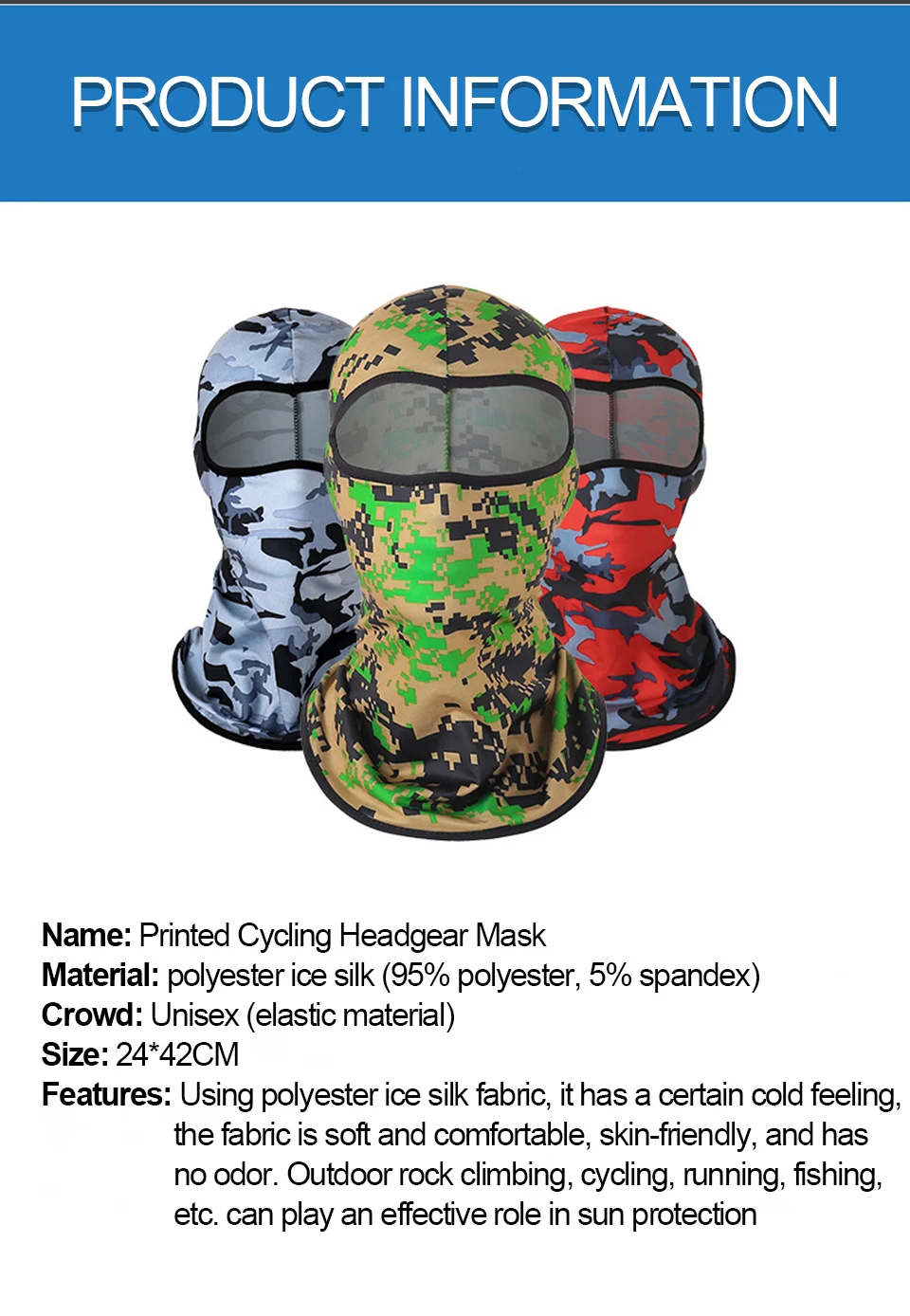 Один размер подходит всемКамуфляжные узорыЛегко дышатьИдеально подходит для всех видов деятельностиРазмер: 24*42 смМатериал: полиэстер, ледяной шелкПосылка включает в себя:1 x шарф для лица