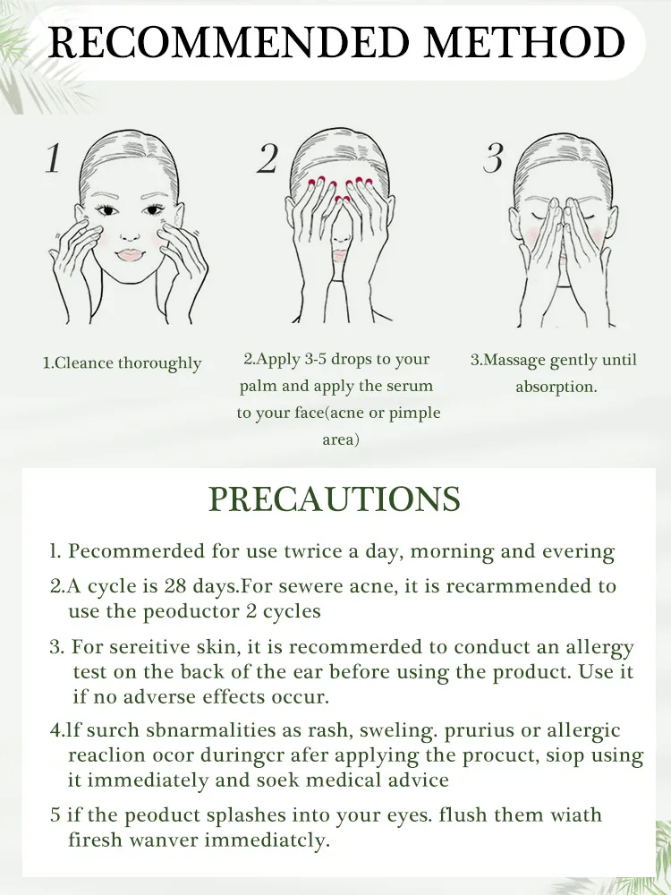 1. Тщательно очистите 2. Нанесите 3-5 капель на вашу ладонь и нанесите сыворотку на лицо (акне или область прыщей) 3. Массируйте мягко до впитывания. Меры предосторожности 1. Используется для суточного, утреннего и вечного цикла 2. А 28 дней. Для акне seware, он повторно используется для людей 2 циклов 3. Для змеиной кожи, это рекоммерцируется для проведения аллергенного теста на задней части уха перед использованием продукта. Использование itif не имеет побочных эффектов. 4. Если surch sbnarmalities как сыпь, раскачивание. Prurius или allergicreaclion ocor duringcr afer применяет procuct, siop usingit немедленно и soek медицинский совет 5 если люди брызгают в ваши глаза. Промойте их wiathfiresh wanver незамедлительно.