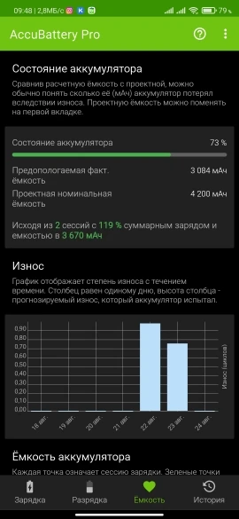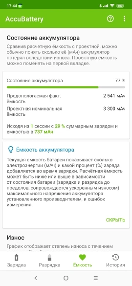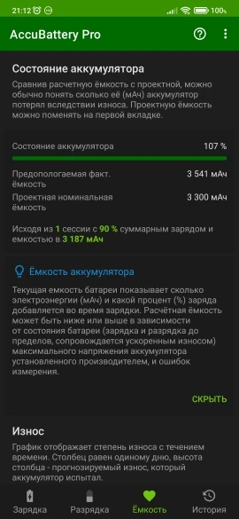 первые 10% от сотни батарея теряет за 10 минут использования. следующий десяток ещё за 10-20 активных минут. после 4 циклов разряда-заряда acubattery показывает ёмкость 3075. в отличие от одной двухлетней батареи эта просто увереннее держит заряд в промежутке 0-70%, старая даже тут уже не справлялась. вторую звезду ставлю за комплектацию, она действительно богатая, и за доставку 5 дней.