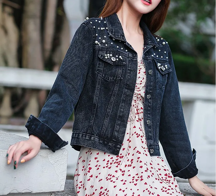 Женская джинсовая куртка с длинным рукавом, укороченная джинсовая куртка с жемчужными бусинами, повседневная куртка в Корейском стиле, весна 2021
