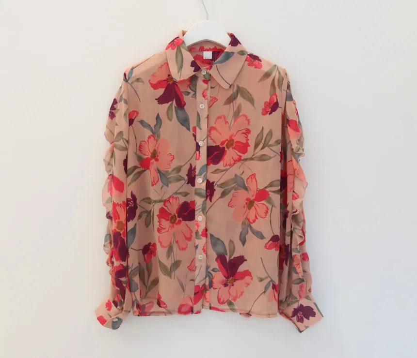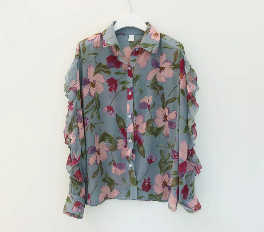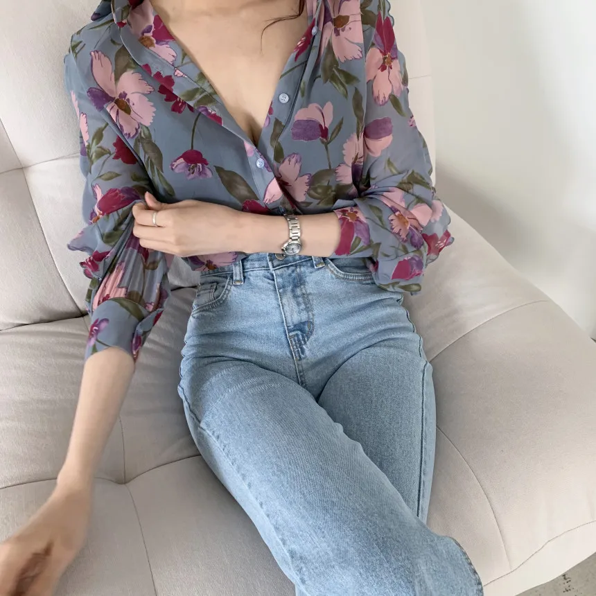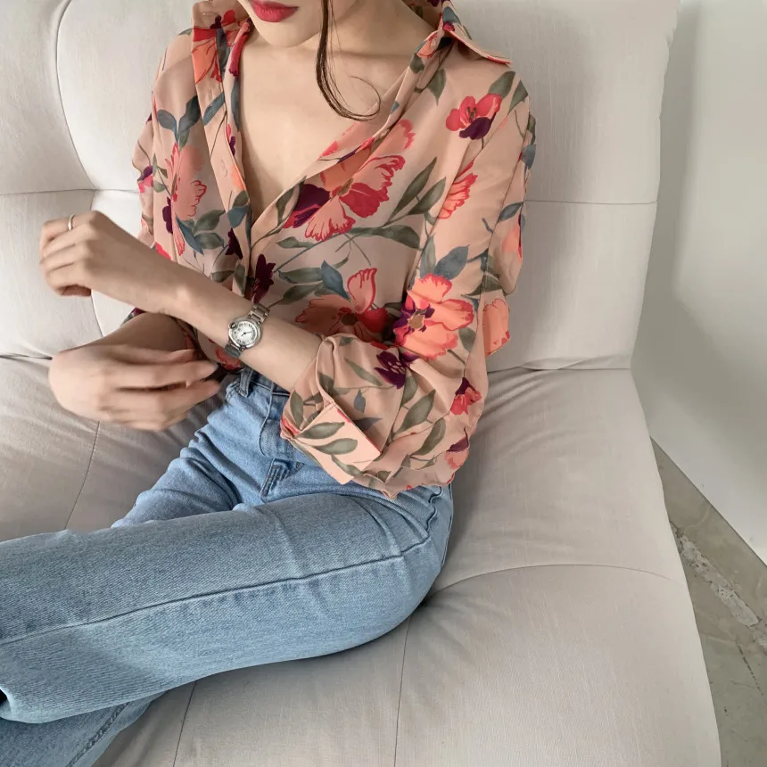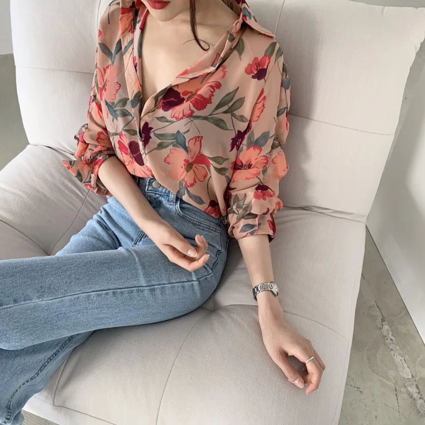 Модная шифоновая блузка с цветочным принтом, рубашка, свободные топы на пуговицах, футболка, повседневный летний женский пуловер с длинным рукавом, новинка 2021