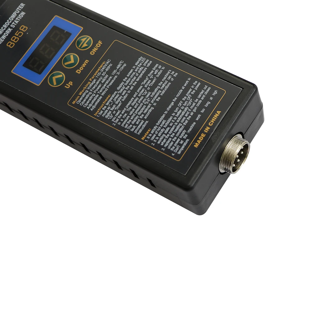 Модель: 858DТип: светодиодный цифровой дисплейПотребляемая мощность: 700 ВтВыходное напряжение: (24 В переменного тока)Диапазон температур: 100 °C-450 ℃Нагревательные компоненты: китайскийДлина ручки: 110 смРазмеры: 138 мм (В) * 10 мм (Ш) * 150 мм (Д)Вес: 1,45 кг