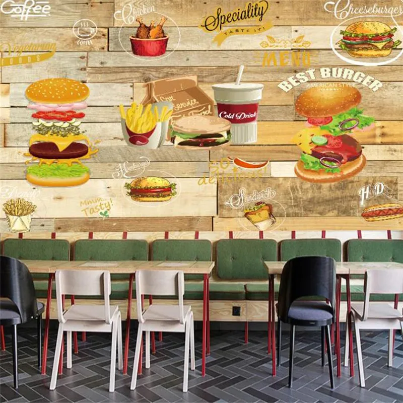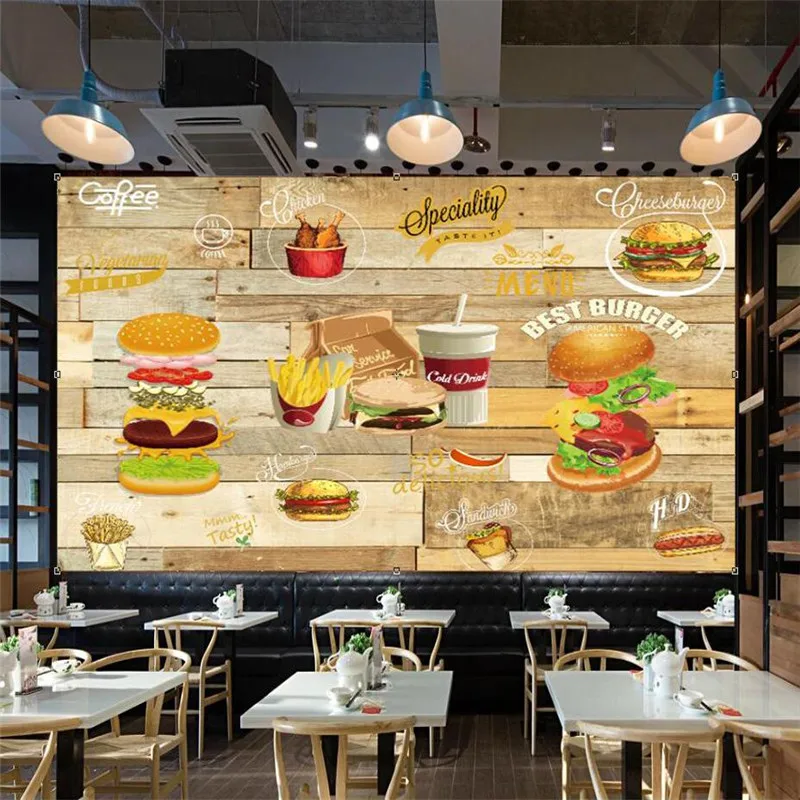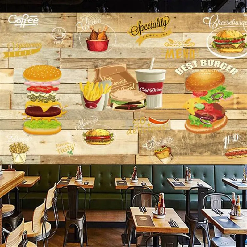 Пользовательские 3D Ручная роспись деревянная доска Фастфуд фон для ресторана, обои Гамбург западный ресторан Декор обои